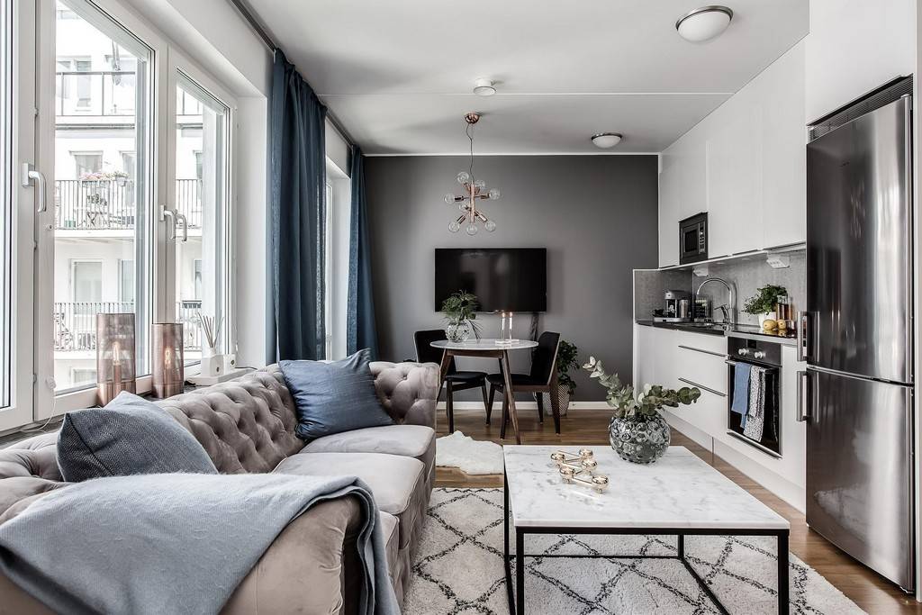 - К тому же, там можно будет сделать бар или поставить стол. Если вы решили не сносить стену, то не завешивайте окно и дверь плотными занавесками.