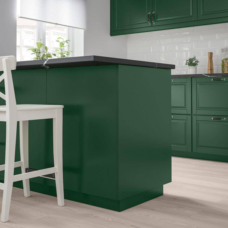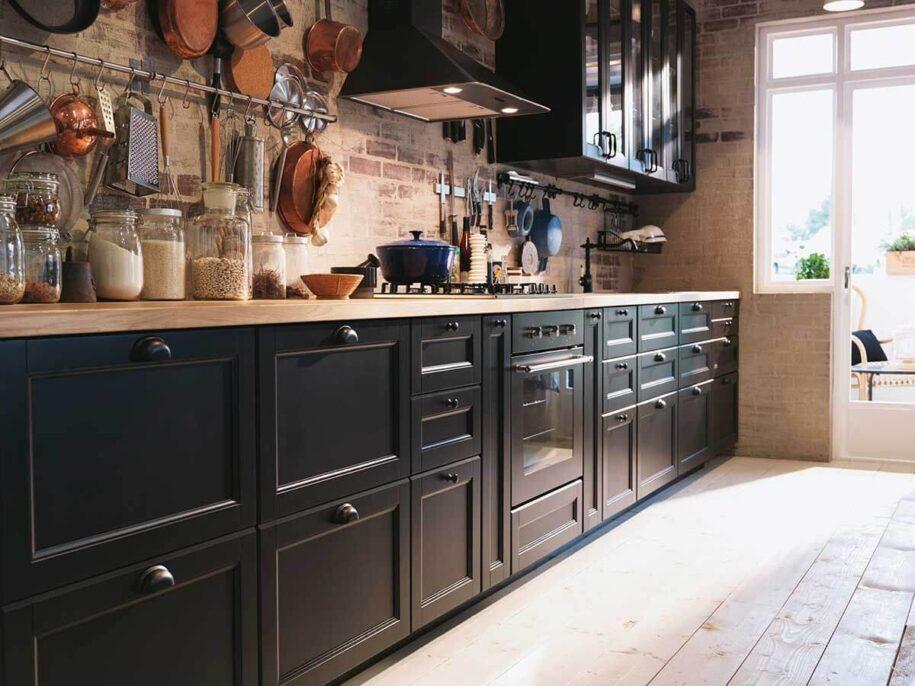 Темнее уже не придумаешь! Черный гарнитур Икеа одновременно немного деревенский (из-за высоких стеклянных шкафов) и классический (благодаря традиционным формам). Отлично сочетается с черным островом Вадхольма. Изготавливается из массива и шпона ясеня.