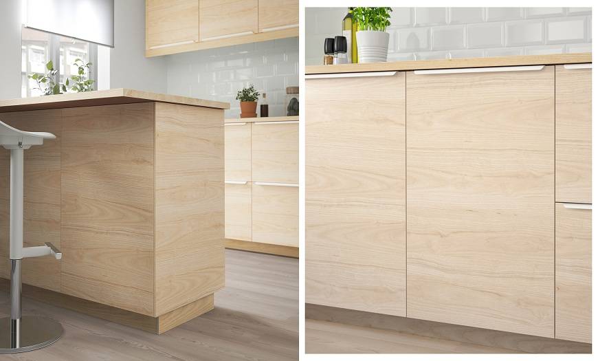 Панели “Аскерсунд” – самые бюджетные в ассортименте модульных кухонь “ИКЕИ”. Фасады выполнены в натуральных оттенках, комбинируются с белыми матовыми. Их можно заказать на замену примелькавшимся дверцам, чтобы сделать недорогой косметический ремонт.