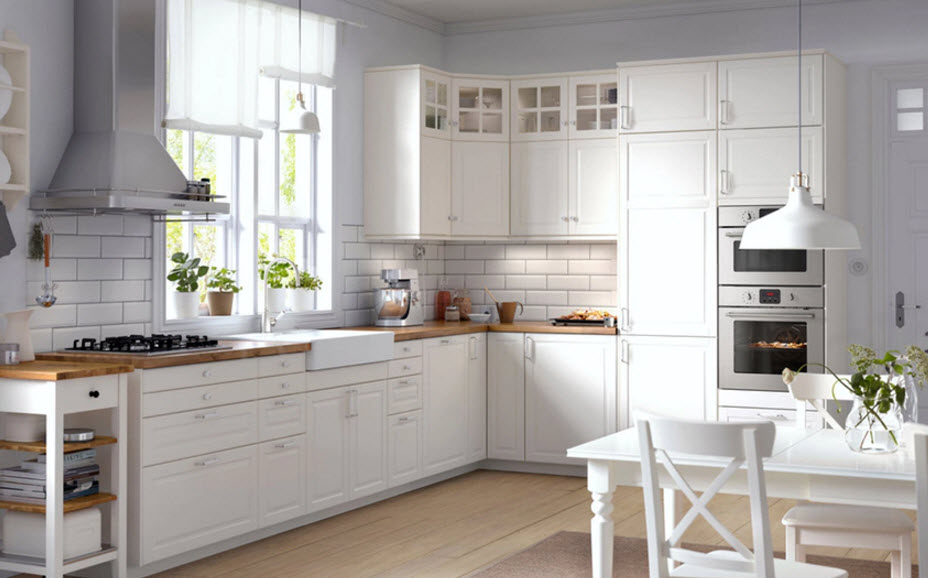 Комфортный и гармоничный интерьер обеспечат простые линии, вставки из стекла на фасадах. Светлые цвета и вертикальные полосы способны визуально расширять пространство. Поэтому гарнитур подойдет и для просторных кухонь и для маленьких. Недорогая цена кухонь «ИКЕА» порадует новых покупателей.