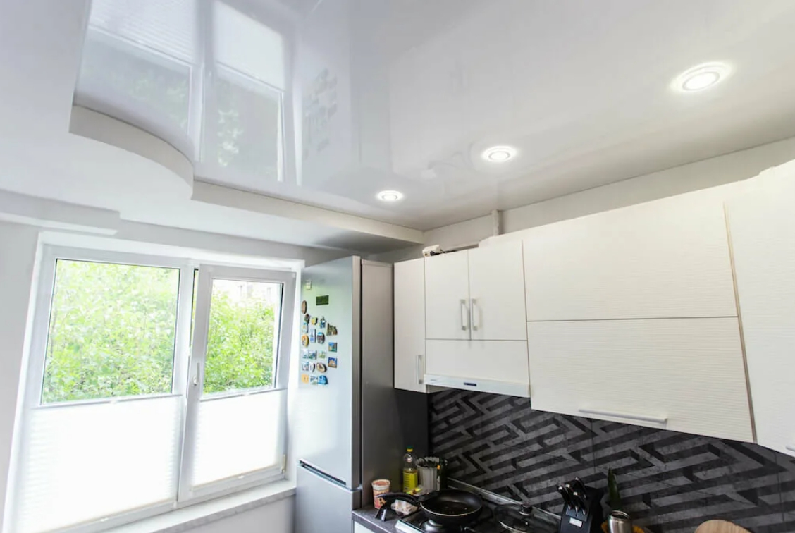 А вот натяжное полотно – неплохой вариант, который спасет ваш ремонт от затопления соседями сверху и поддается влажной уборке, что немаловажно для кухни. Глянцевый потолок – еще один способ сделать кухню просторнее, светлее и придать ей современный вид