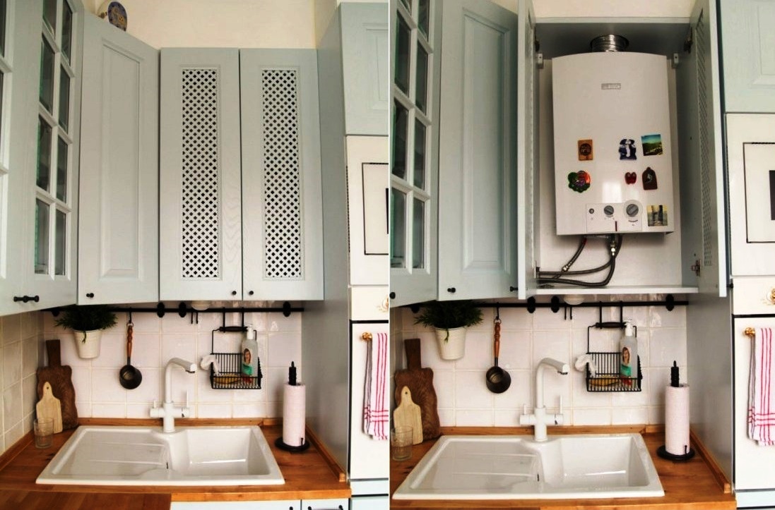 Просмотрите состояние газовой колонки и труб. Старое оборудование должно подлежать замене. Трендовую технику можно использовать без дополнительного декора. Также можно оборудование скрыть. Подойдут шкафы или гипсокартонные коробы.