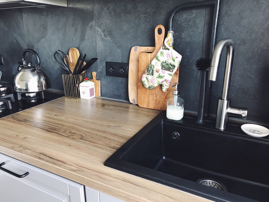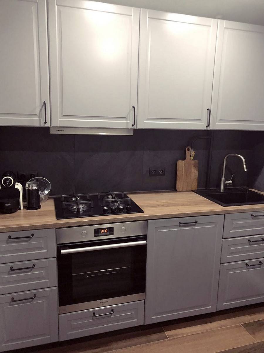 Не редко используют вместе с темным фартуком, как бы разделяя верхнюю и нижнюю часть гарнитура.