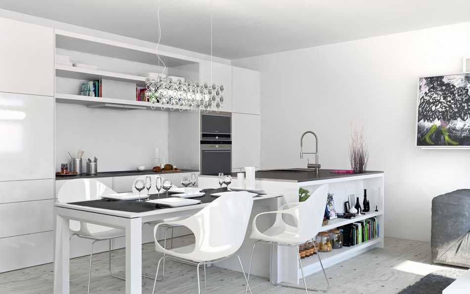 Интерьер кухни в квартире-студии, выполненный в белых тонах, произведёт очень приятное впечатление на ваших друзей. Безусловно, светлая кухня крайне требовательна в уходе, ведь её идеальный вид возможен только при тщательном соблюдении чистоты. Поэтому выбирайте материалы, которые будут легко очищаться.