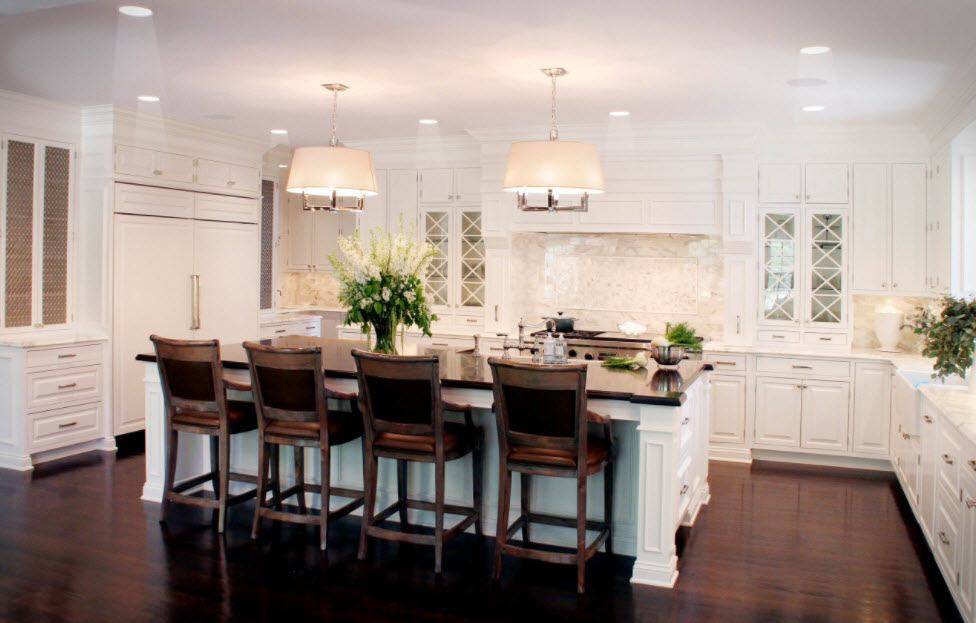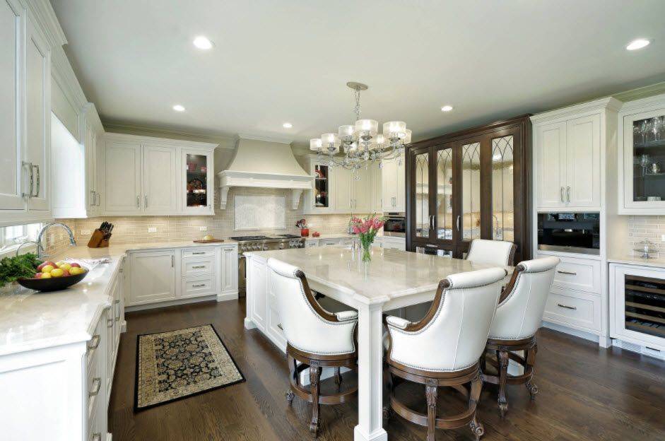 В классическом дизайне белой кухни, кроме навесных и напольных шкафчиков, уместно будет смотреться сервант из натурального дерева со стеклянными витринами, который напоминает гостям о достатке хозяев. Все фасады должны иметь глянцевую поверхность с элементами позолоты или патины, которые подчёркивают изящество классики. Ножки кухонной мебели, стульев и обеденного столика должны быть изогнутыми с элементами инкрустации. Допускается лепнина по периметру и центру потолка. В качестве декора используют хрусталь. Завершить образ классического оформления следует дорогими шторами и скатертью в насыщенной цветовой гамме.
