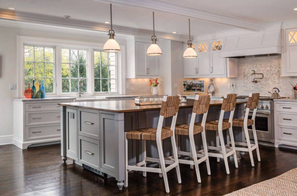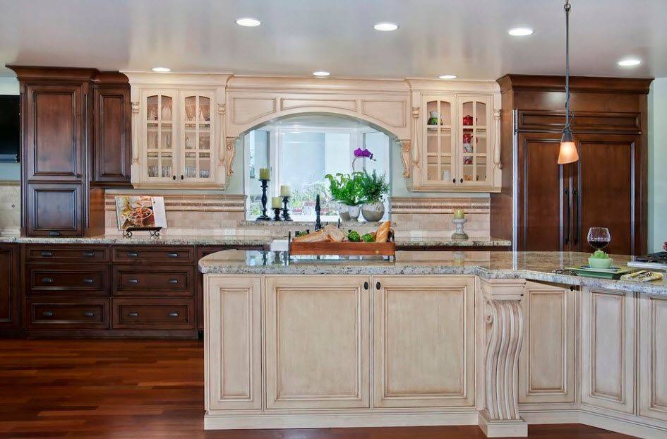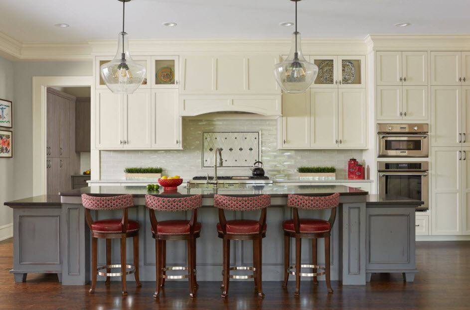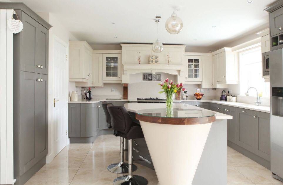Выбирая подобный дизайн гарнитура следует обращать внимание на ширину образовавшегося прохода. Нельзя чтобы он был слишком узким или напротив очень широким
