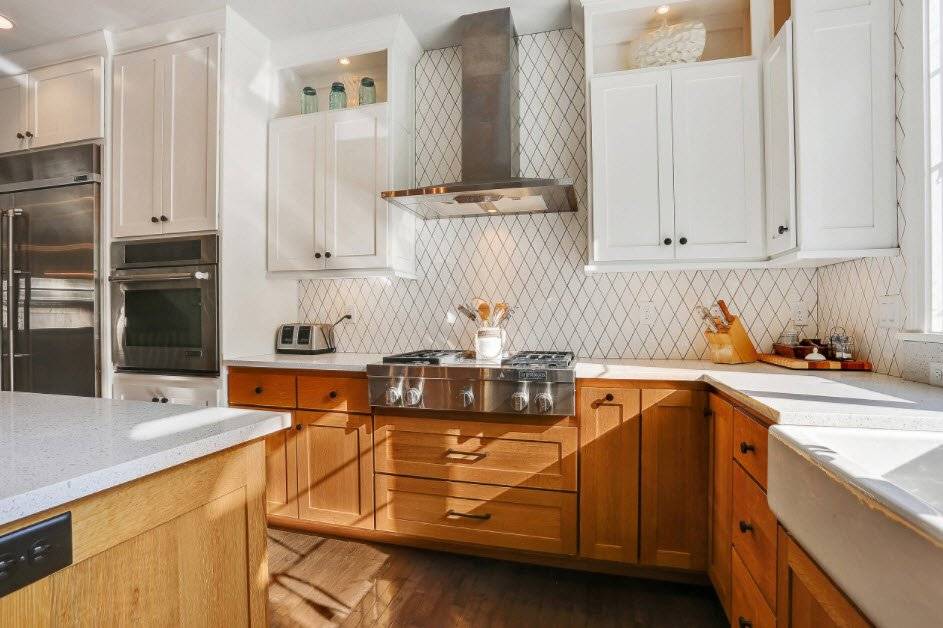 Идея 1. Белая кухня с деревом натурального оттенка