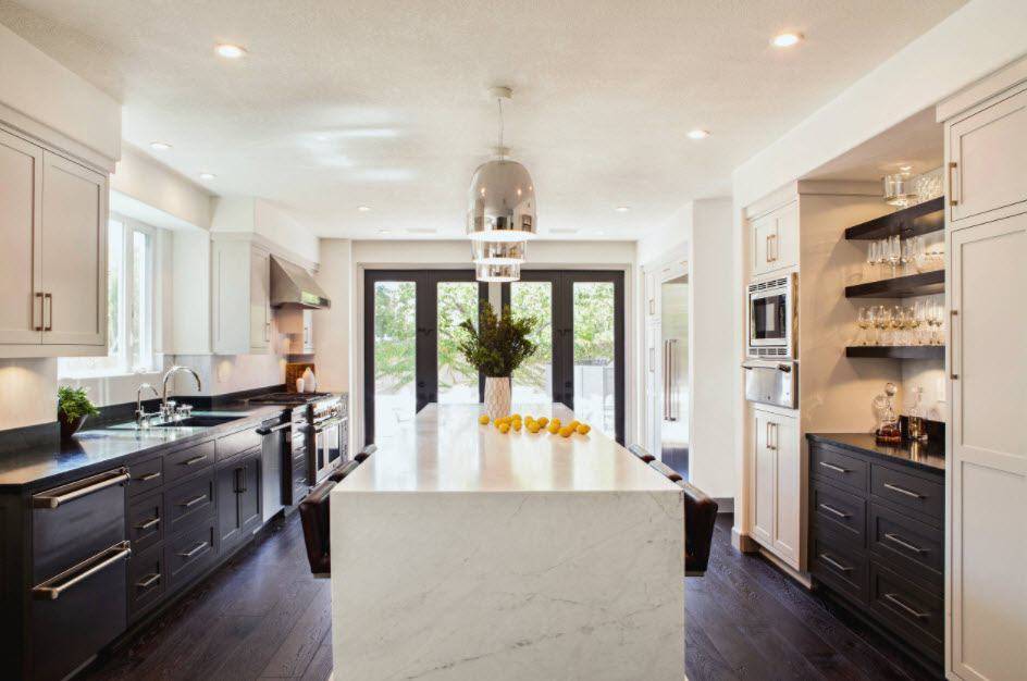 Классическое сочетание белой кухни со столешницей чёрного цвета в стиле ар-деко