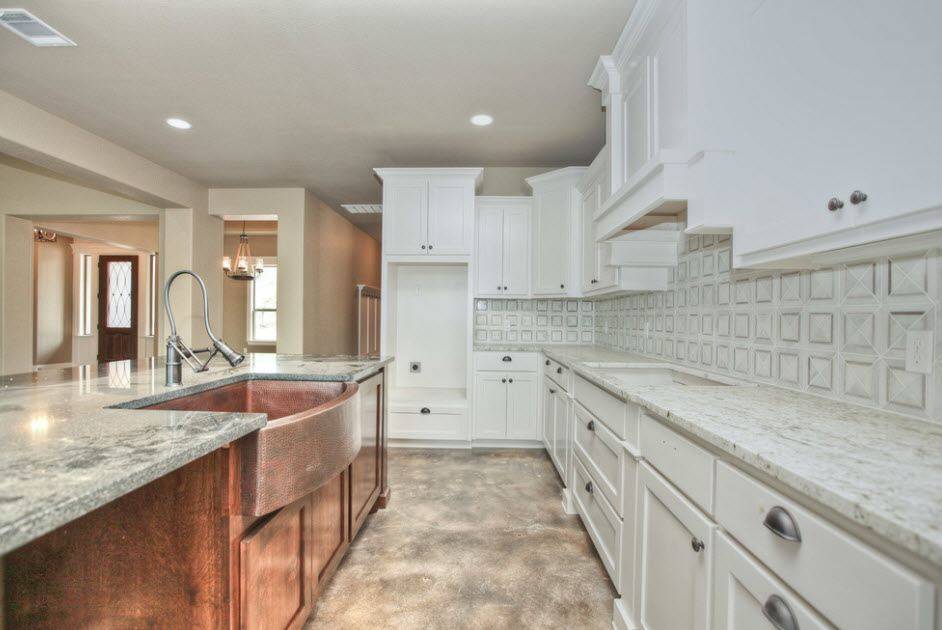 - Белый – из панелей, кирпича или плитки. Отлично будет смотреться такой вариант в белой кухне, имеющей разноцветные фасады.