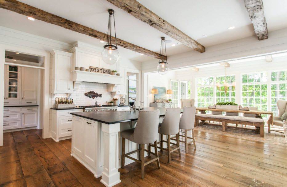 Комбинация белого цвета и дерева натурального оттенка очень приятна глазу, а еще она универсальна, а главное — просто создана для реальной жизни. Неспроста белая кухня с деревянной столешницей и полом является одной из самых популярных во всем мире.