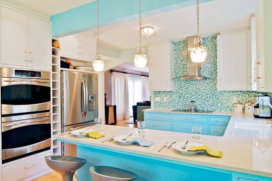 Еще один распространенный вариант – это создание гармоничного интерьера посредством объединения цветовыми акцентами кухонных больших поверхностей и кухонного гарнитура. Современное дизайнерское искусство предлагает для кухни использование сочных насыщенных оттенков. Даже возможны яркие контрасты, которые могу быть неприемлемы для спальни, гостиной или детской комнаты.