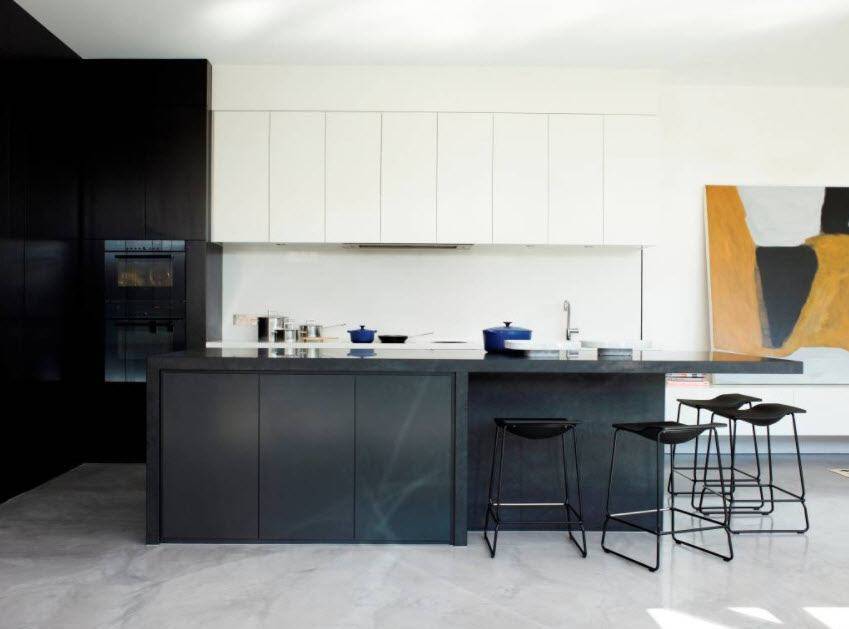 А вот фото белой кухни в стиле хай-тек с черной техникой и сантехникой.