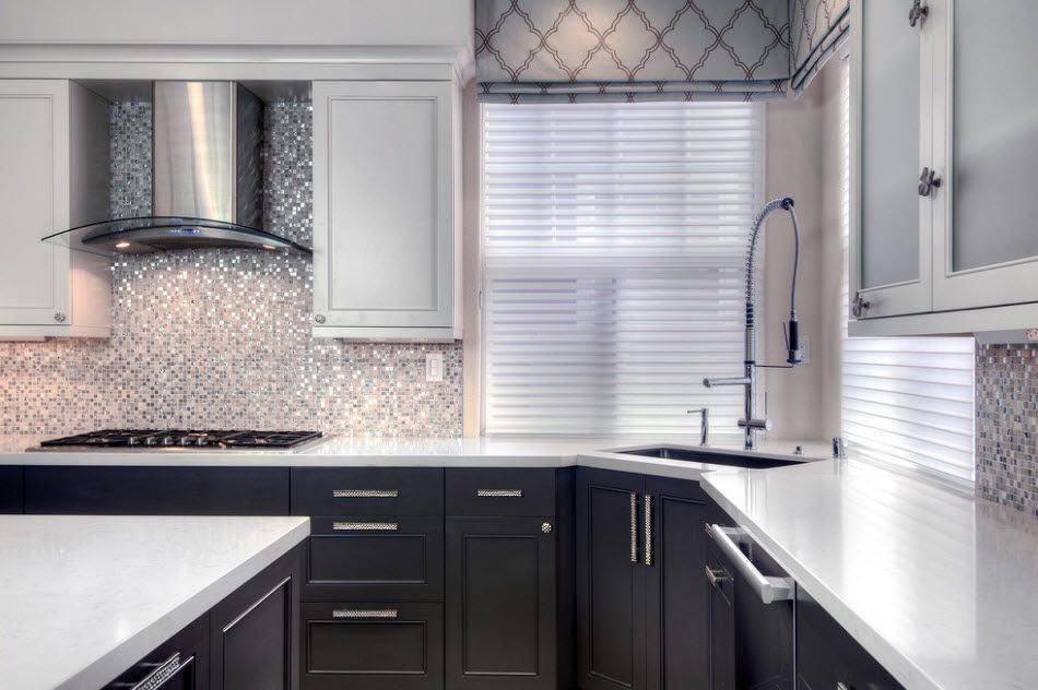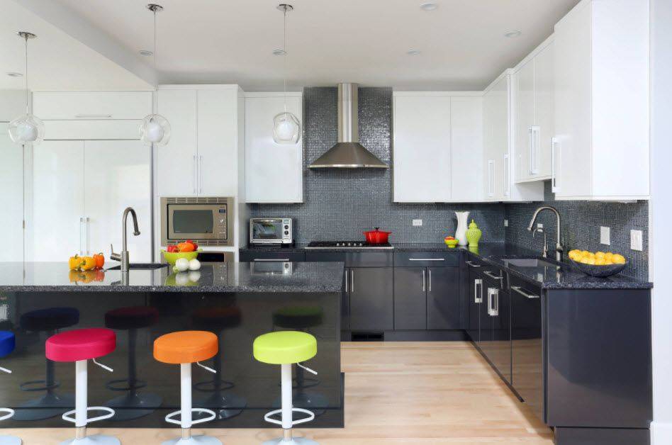 Так как нижние шкафы пачкаются быстрее всего, они могут быть более практичного цвета (например, белого), а верхние – менее практичного, но очень красивого (например, черного цвета с глянцем).