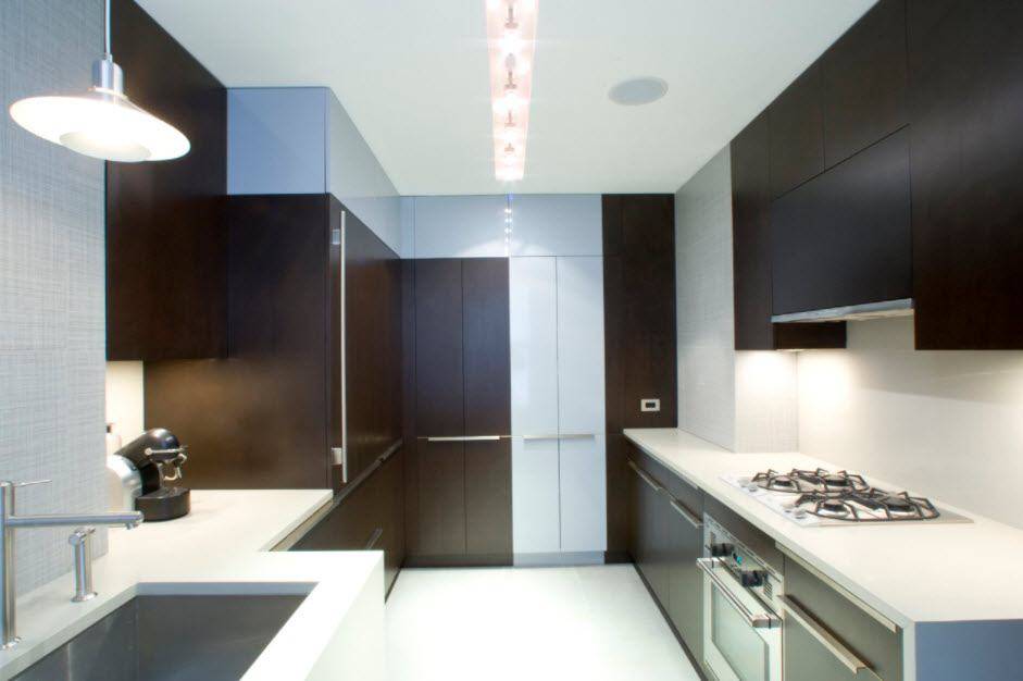 Подобный гарнитур устанавливается вдоль двух стен, расположенных параллельно друг другу. Такой дизайн можно успешно вписать в помещение любого размера или стиля.