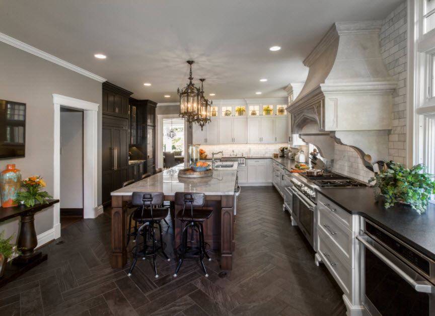 Выбор напольного покрытия для кухни ограничен ее функциональными особенностями, а помещение, оформленное в черно-белых тонах, требует отдельного подхода к материалам. Среди наиболее востребованных можно выделить: