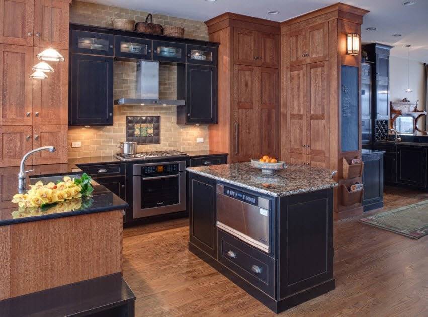 Одна часть гарнитура может быть белой, а другая – деревянной, цветной, черной или любой другой. Решение простое, не банальное и может принести много пользы. Например, одну часть шкафов можно оформить в тон стен, чтобы получился эффект невидимости, и пространство казалось менее загроможденным.