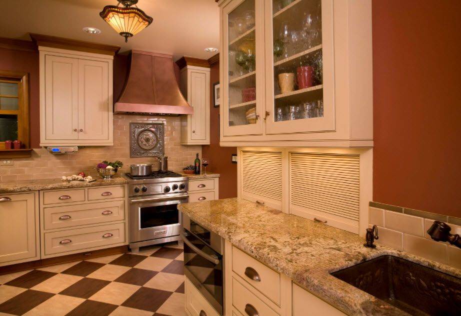 На первый план в таком дизайне выходят современные технологии и изысканность материала. Ар-деко напоминает калейдоскоп, в котором все элементы можно комбинировать в любом варианте, каждый раз получая более новые решения для изменения интерьера. На кухне в таком стиле белая мебель будет удачно сочетаться с отделкой пола в виде чёрно-белой шахматной доски, фотопримеры реальных интерьеров представлены в нашей галерее. А в дополнение к этому и столешницу также следует выбрать чёрного цвета. Оживить такой дизайн можно бытовой техникой из нержавеющей стали и ярких акцентов в зелёной, красной и золотой гамме.