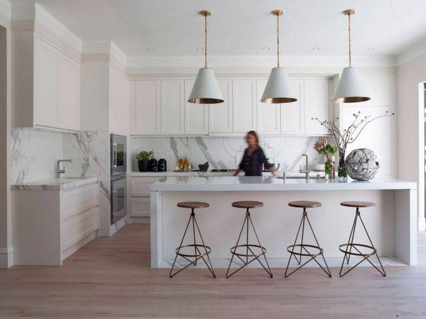 Угловые белые кухонные гарнитуры практично организовывают пространство, выглядят универсально в любом стиле, отличаются наличием глубоких боковых шкафов и мойкой или плитой в углу. Угловой гарнитур дополняют барной стойкой, если это небольшая кухня, или островной частью, если это просторное помещение.
