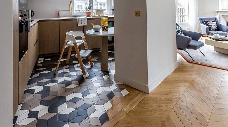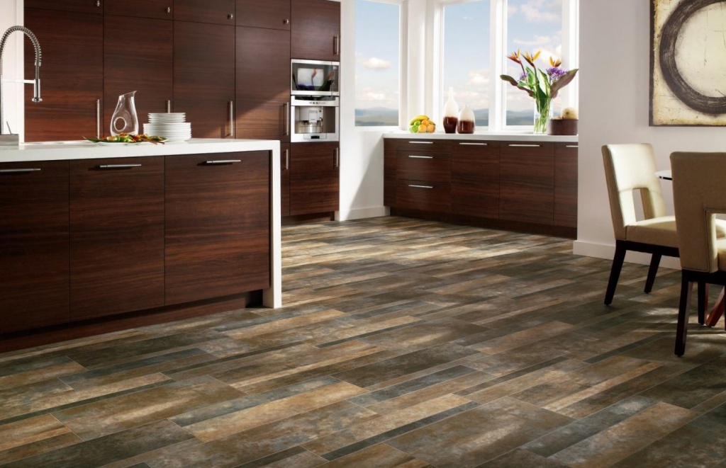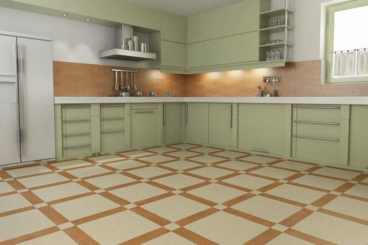 Самый простой вариант — пол из плитки, цвет которой зависит от дизайна интерьера. Всегда уместным будет оформление светлой плиткой, оттенок которой соответствует фасадам мебели.
