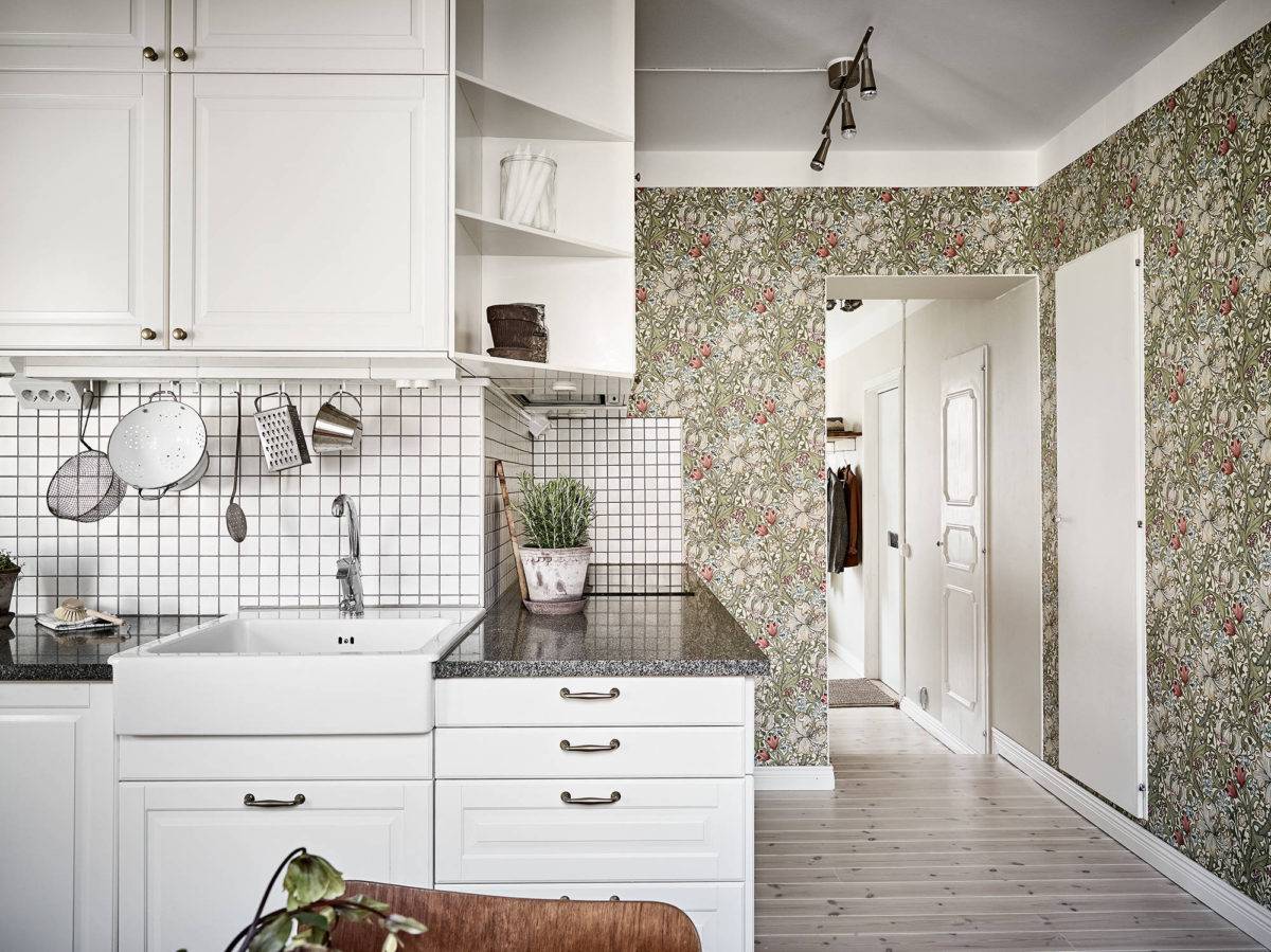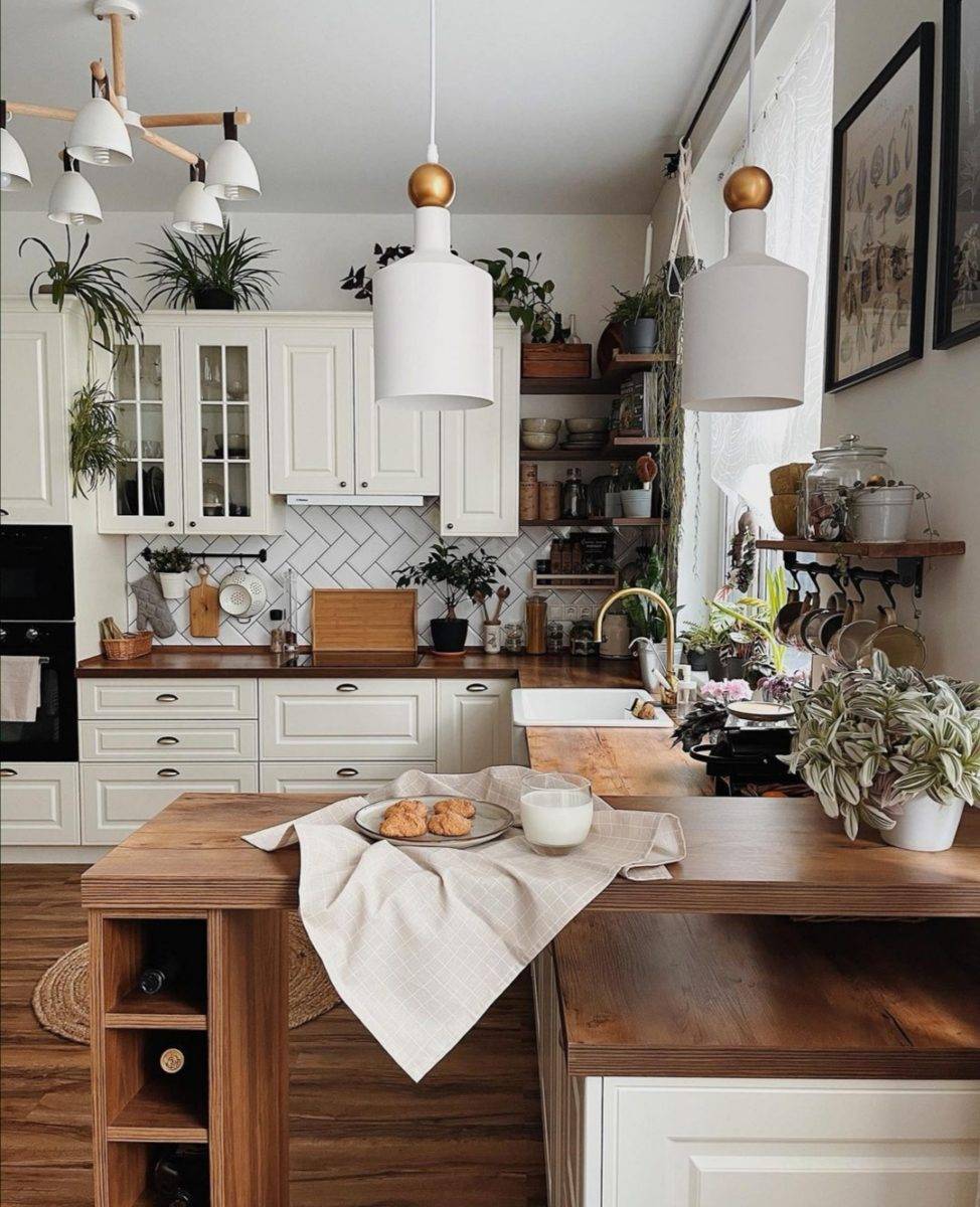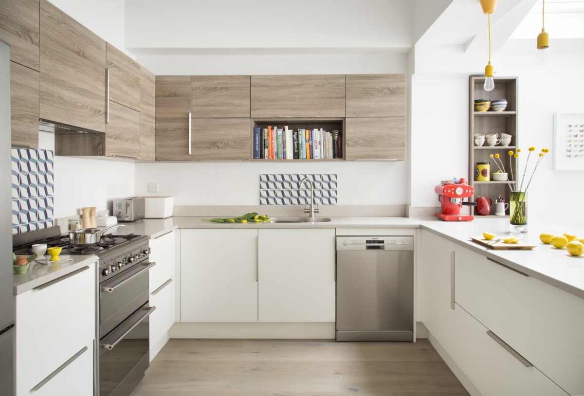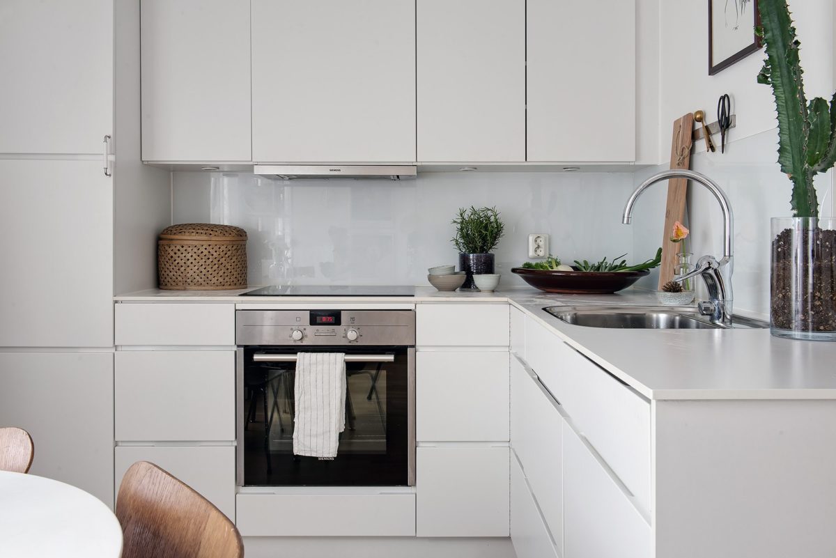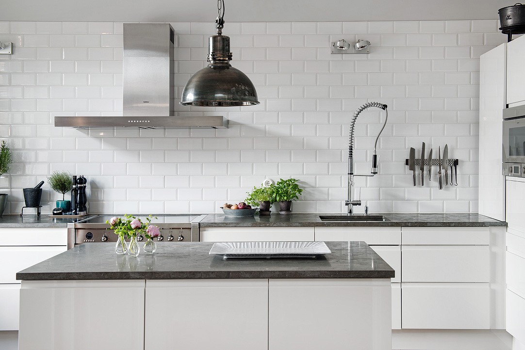 Сочетание белого с деревом прекрасно впишется в скандинавский стиль. В такой кухне будет тепло и уютно даже в холодный зимний день. Дополнение чистого белого металлом создает обратный эффект: кухня становится холоднее, но у нее появляется особый шарм.