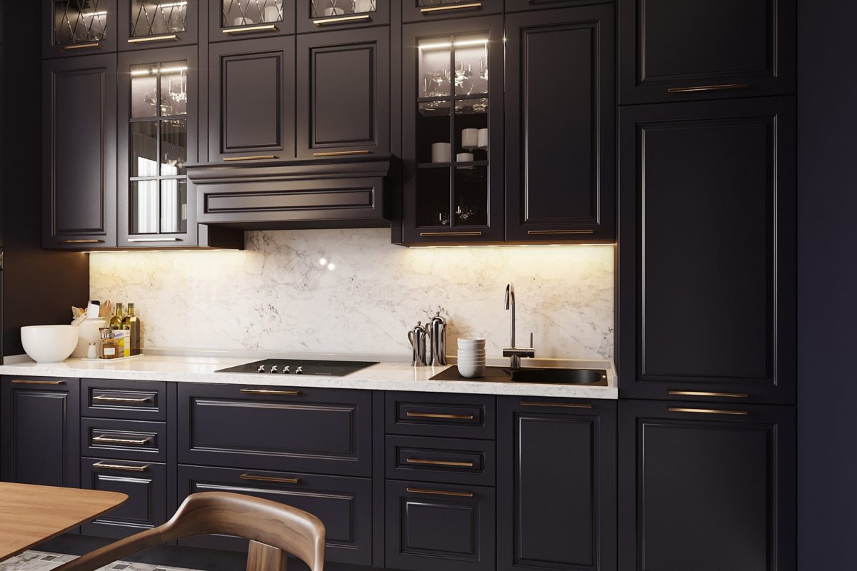 Чёрный цвет — оригинальное решение для большой кухни. На фоне белых стен матовый чёрный гарнитур выглядит элегантно и дорого. Решение не для хрущёвок — компактная превратится в тёмную кладовку. Кстати, мы уже подробно писали про дизайн кухни в хрущёвке.