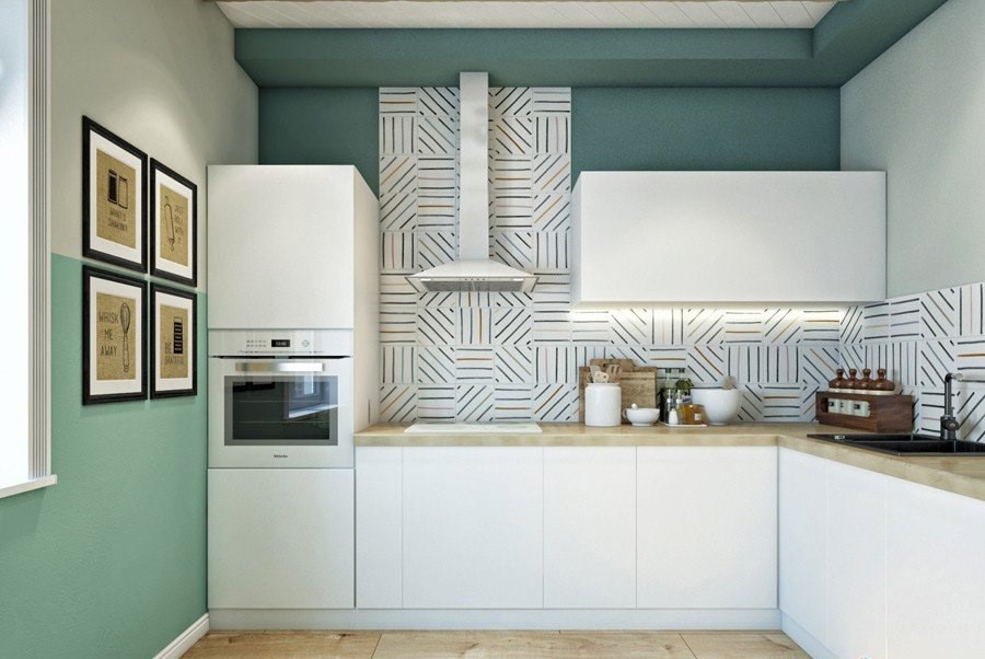 - Изменение пропорций помещения. Правильно подобранные фактуры и оттенки могут визуально увеличить высоту потолка, создать иллюзию простора даже в небольшой кухне.