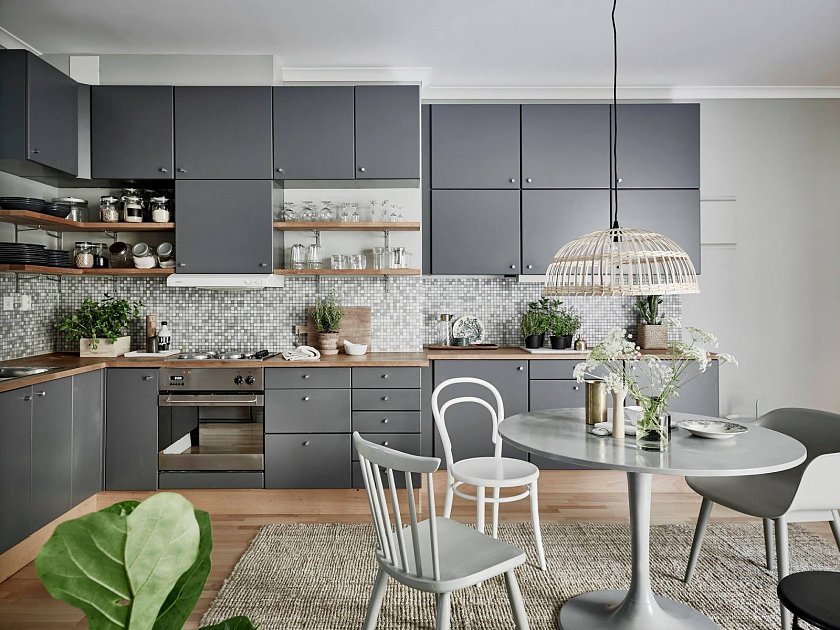Если места в кухне мало и каждый сантиметр свободного пространства на счету, то вместо убранных верхних шкафов можно повесить открытые полки без дверок. Так и банки с приправами и специями будет куда поставить, и громоздкой мебели на стене не будет.