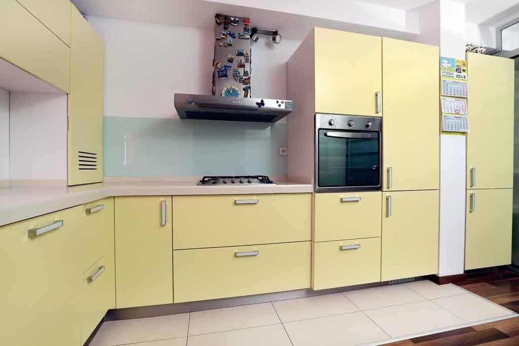 - Плиты ЛДСП. Ламинированные древесно-стружечные плиты выглядят привлекательно, блестят на солнце и просты в уходе. Однако со временем из-за воды и пара фасады разбухают, становятся блеклыми. Из-за воздействия солнца белые поверхности желтеют. Несмотря на это, ЛДСП активно используют для производства гарнитуров эконом-класса.