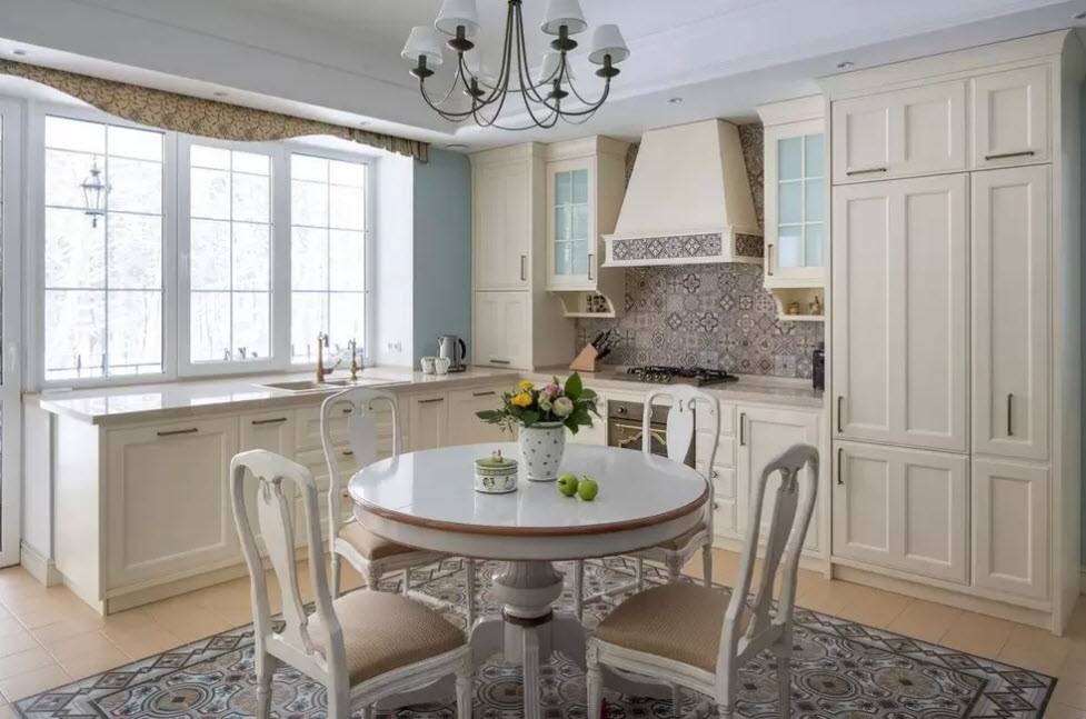 Несмотря на то, что белый — универсальный цвет, которому подходит вся палитра оттенков, в этом случае лучше отказаться от радикальных решений. Оставьте красный, синий, желтый и прочие яркие тона для более современных стилей. Конечно, можно найти интересное решение. И все же есть ряд проверенных временем вариантов, которые выглядят интересно и свежо в подобном оформлении кухни.