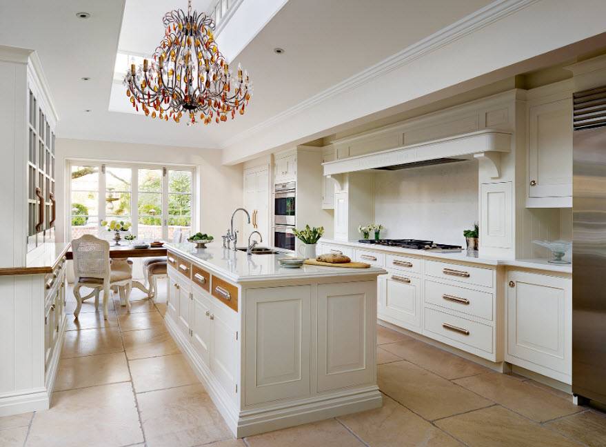 На кухне в классическом интерьере обязательно должен присутствовать один основной мощный источник света. Чаще всего это массивная люстра, расположенная прямо над обеденным столом.
