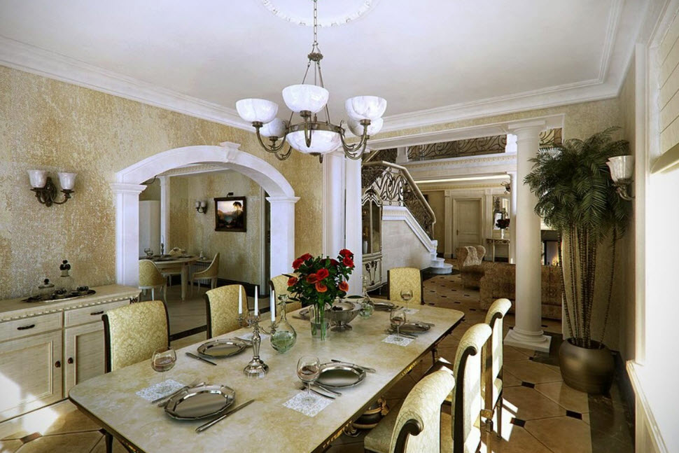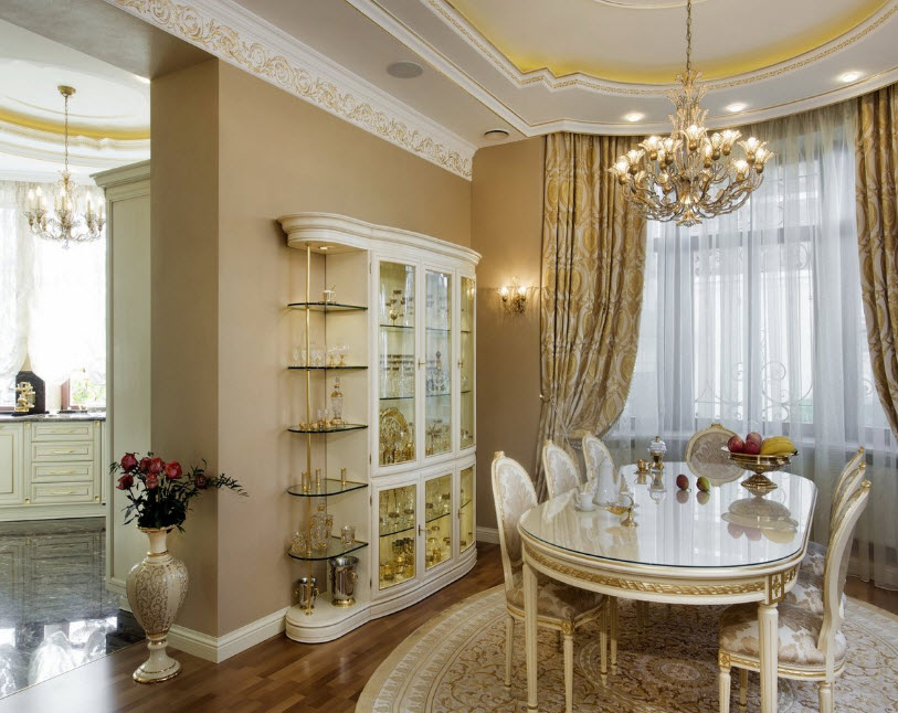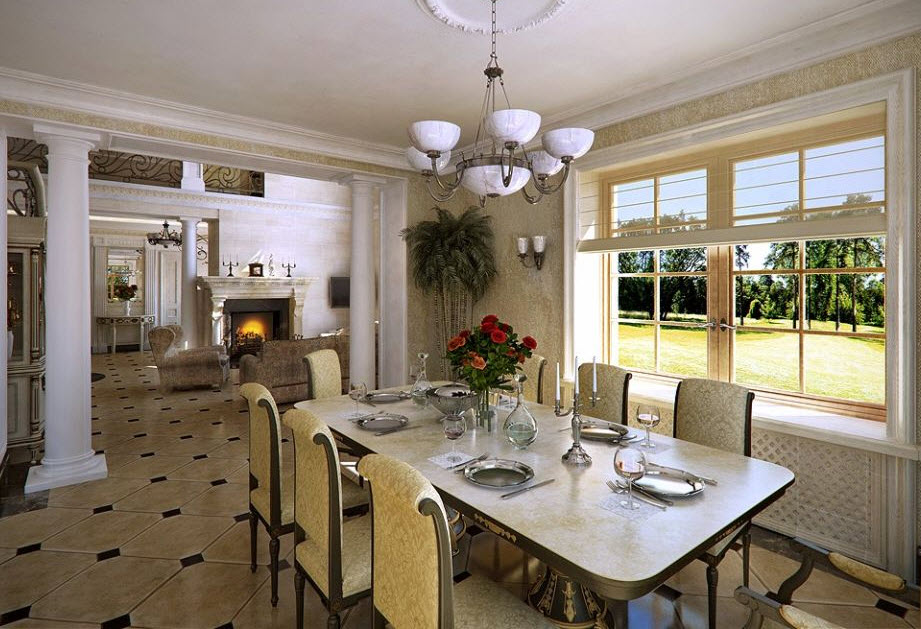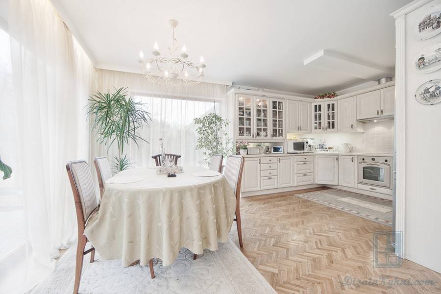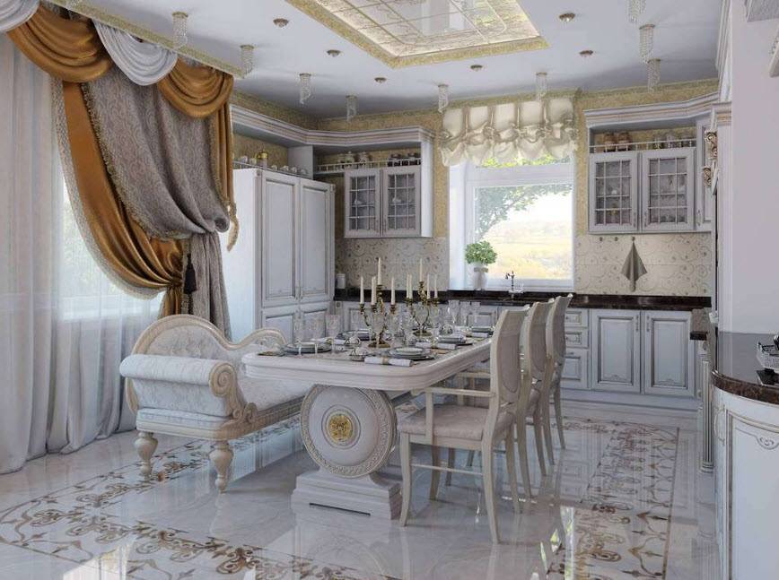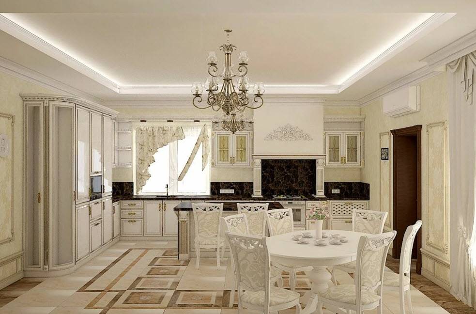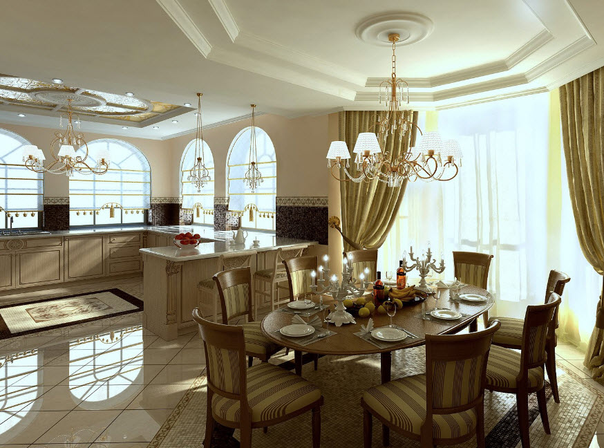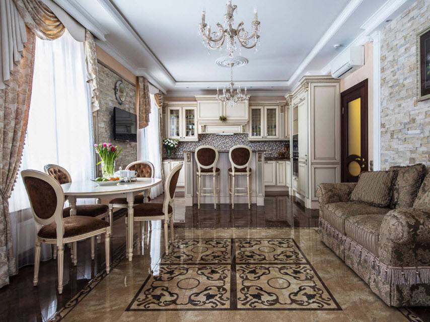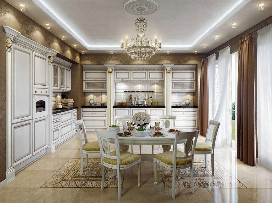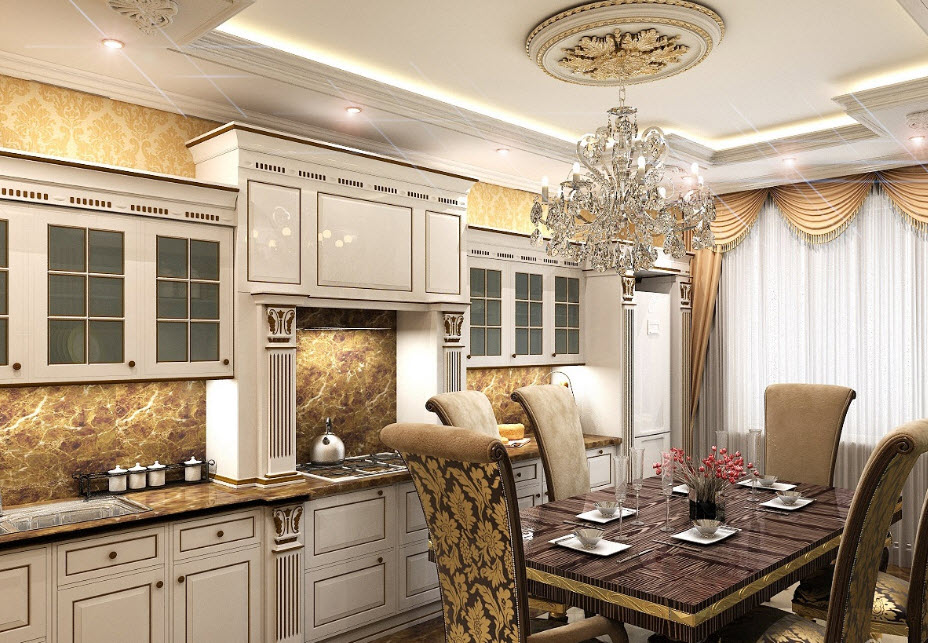 Иногда из любого правила есть исключения. Например, такие. Дизайнер объединил в одно пространство кухню, столовую и гостиную. Этот ход заслуживает внимания, но придется очень тщательно все продумать. Тут несложно переборщить и утратить присущее классическому стилю изящество.