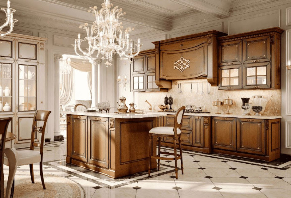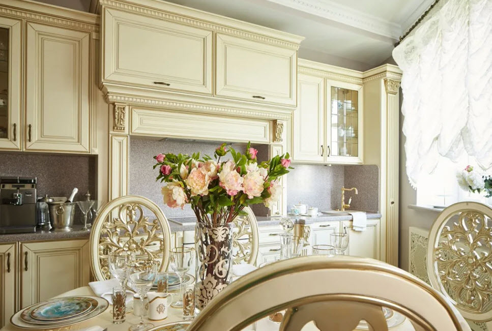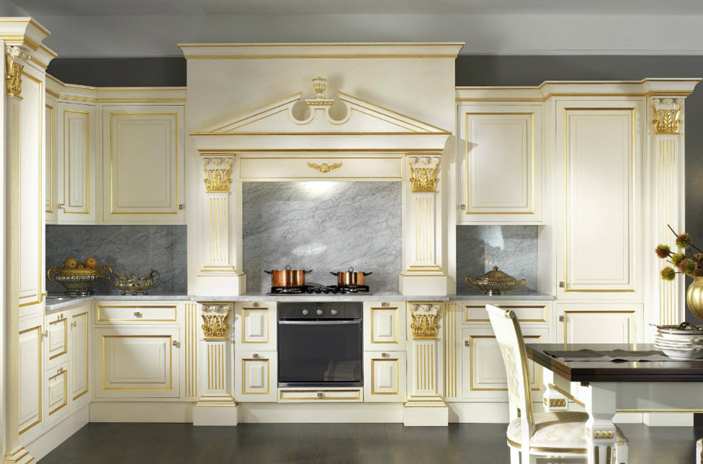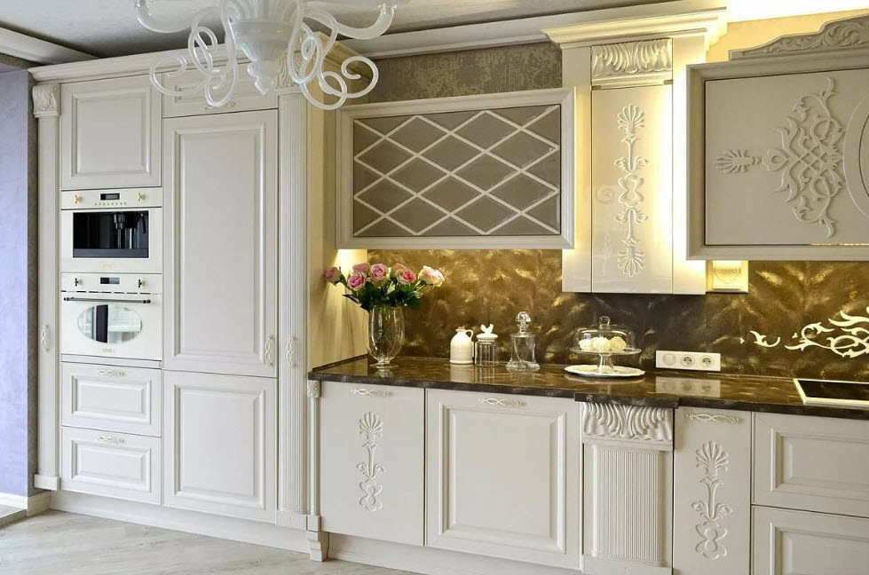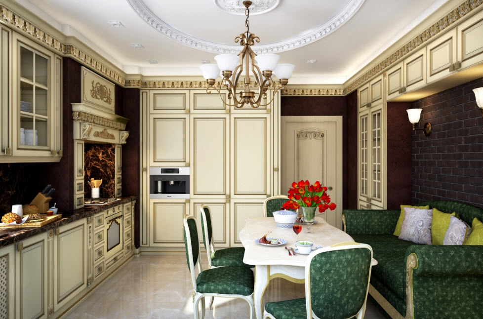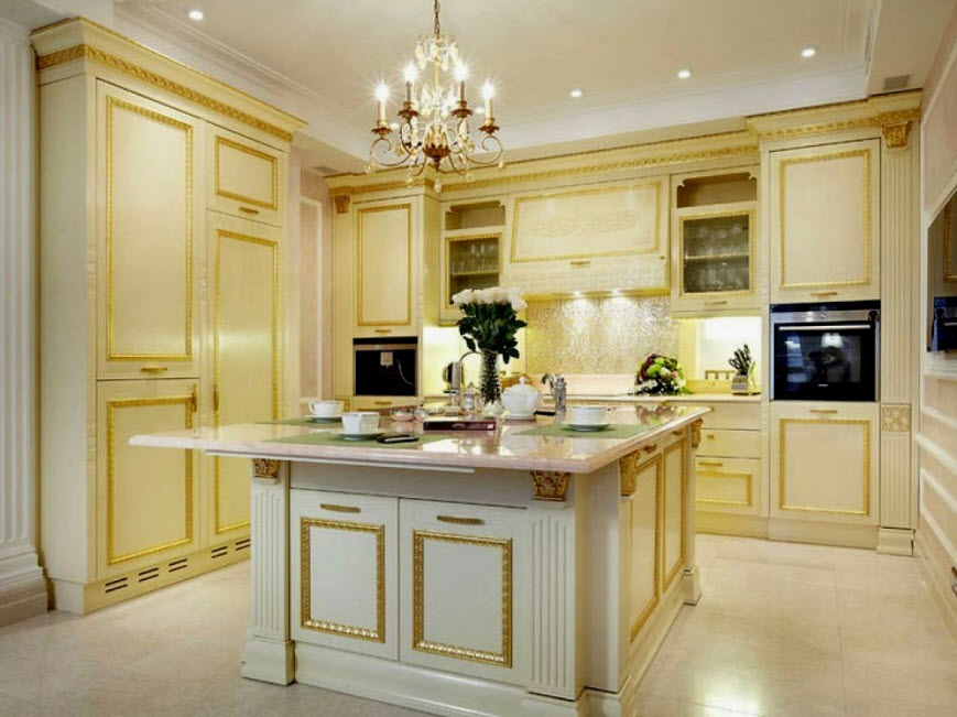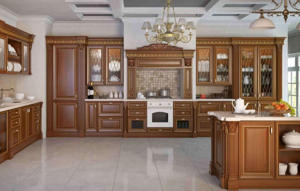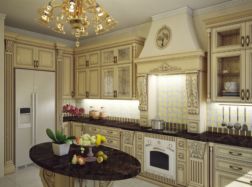 Недорогие синтетические материалы способны «удешевить» кухню, и превратить ее в обычное затрапезное помещение с банальным «евроремонтом». Подчеркнуть изящество и элегантность классического интерьера кухни поможет изысканный декор поверхностей: лепнина, позолота, резьба. Обстановка должна быть благородной и торжественной.
