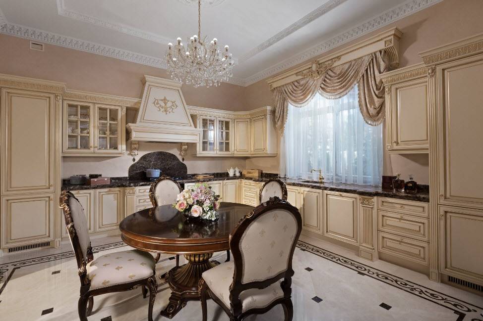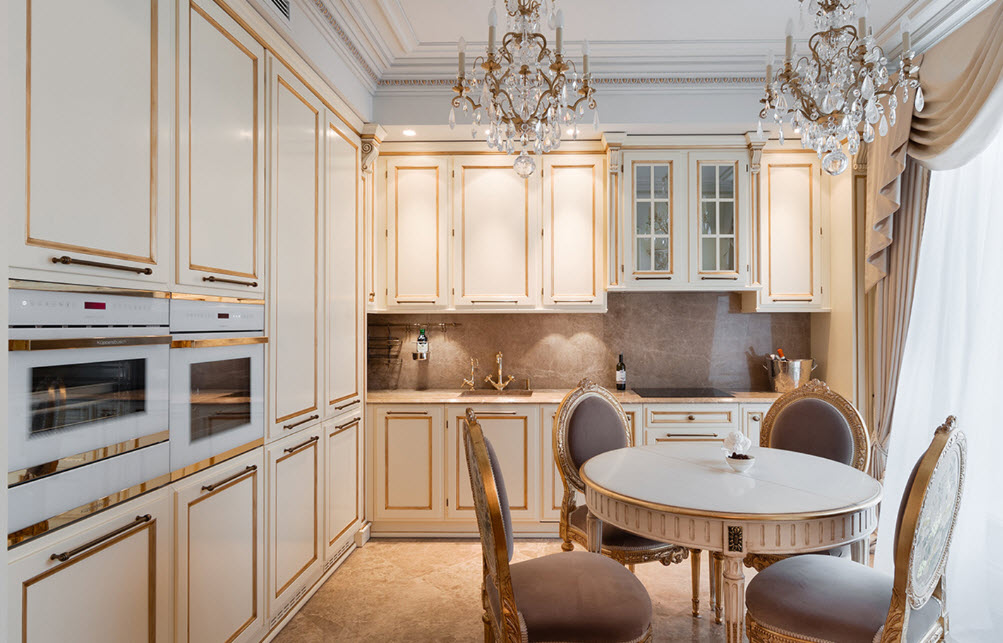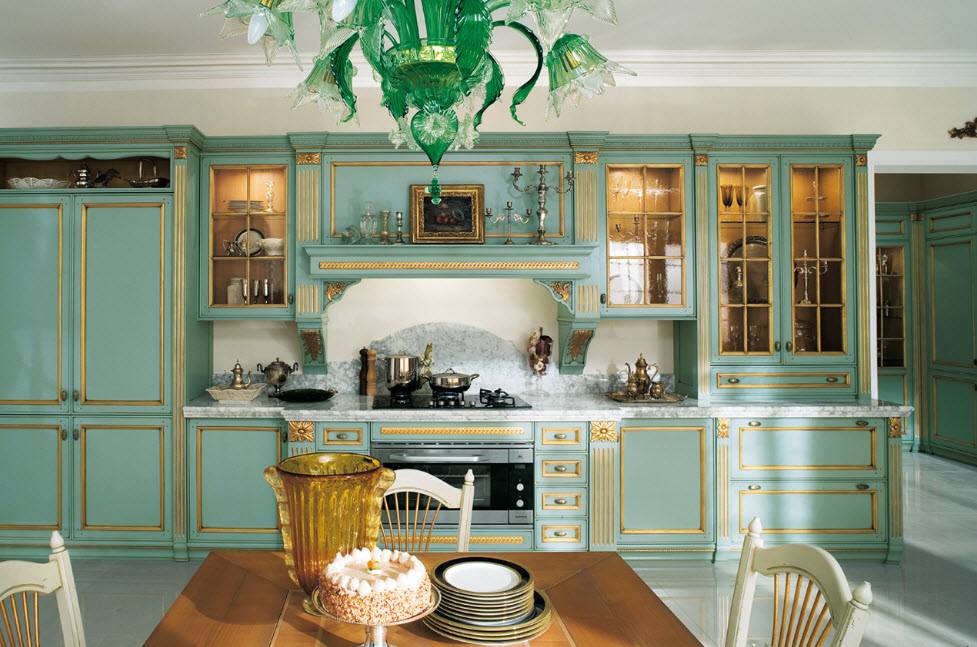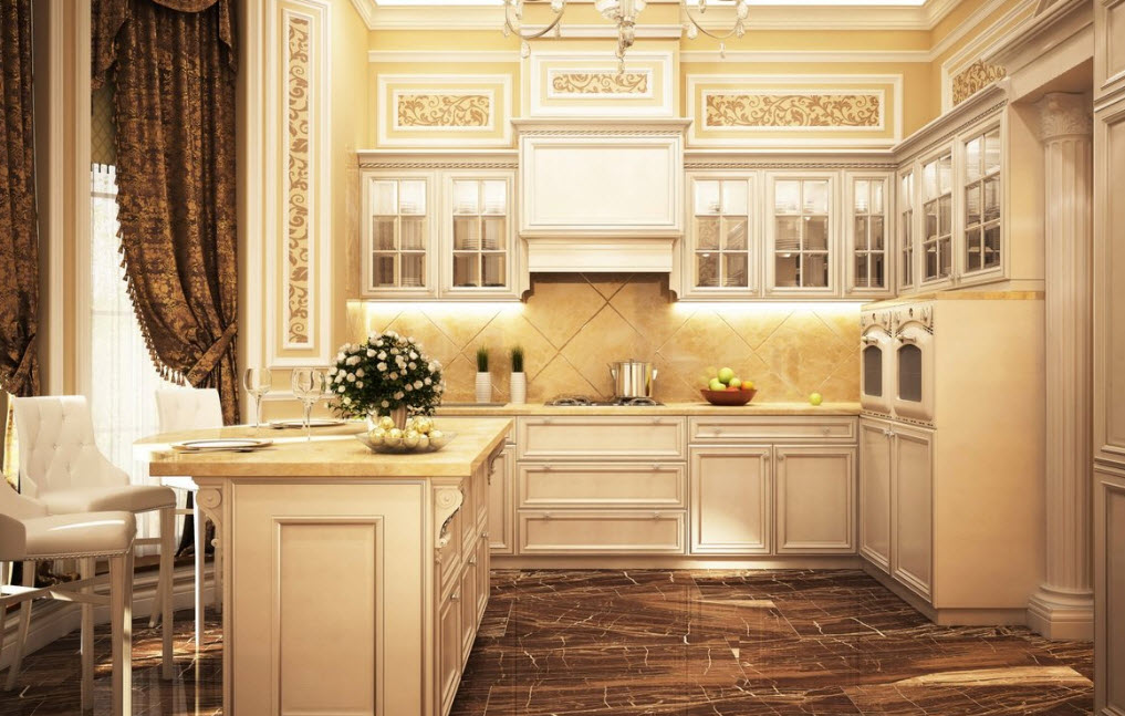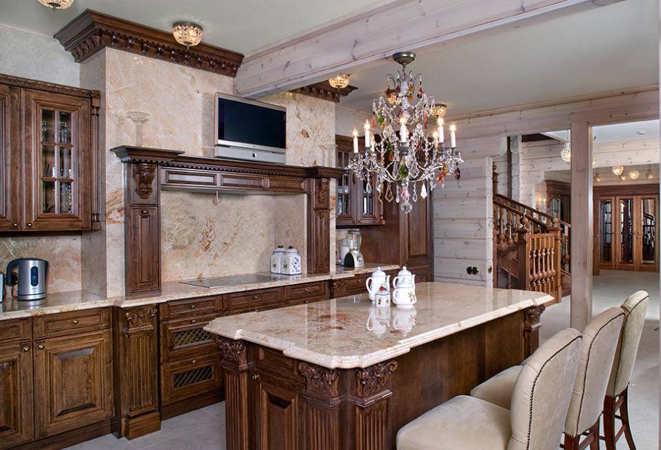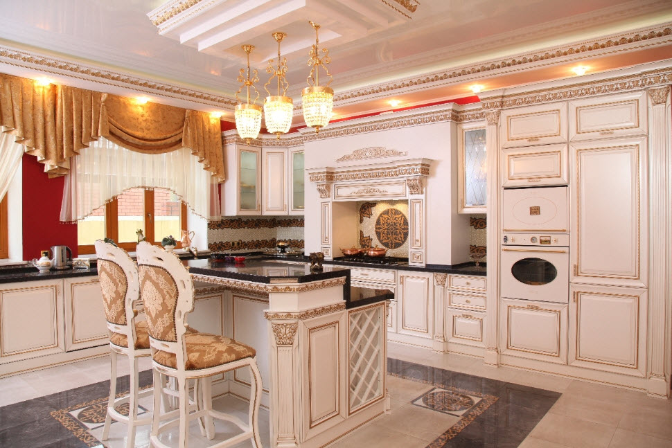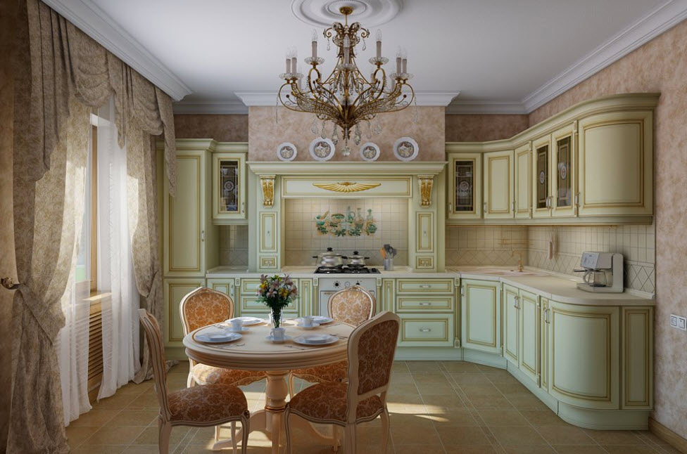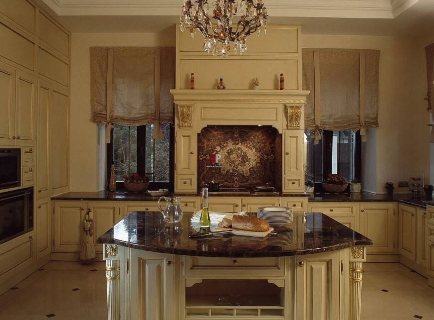 Недорогие синтетические материалы способны «удешевить» кухню, и превратить ее в обычное затрапезное помещение с банальным «евроремонтом». Подчеркнуть изящество и элегантность классического интерьера кухни поможет изысканный декор поверхностей: лепнина, позолота, резьба. Обстановка должна быть благородной и торжественной.