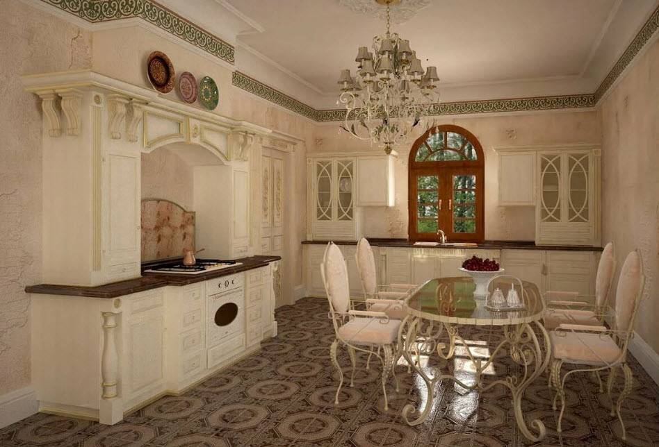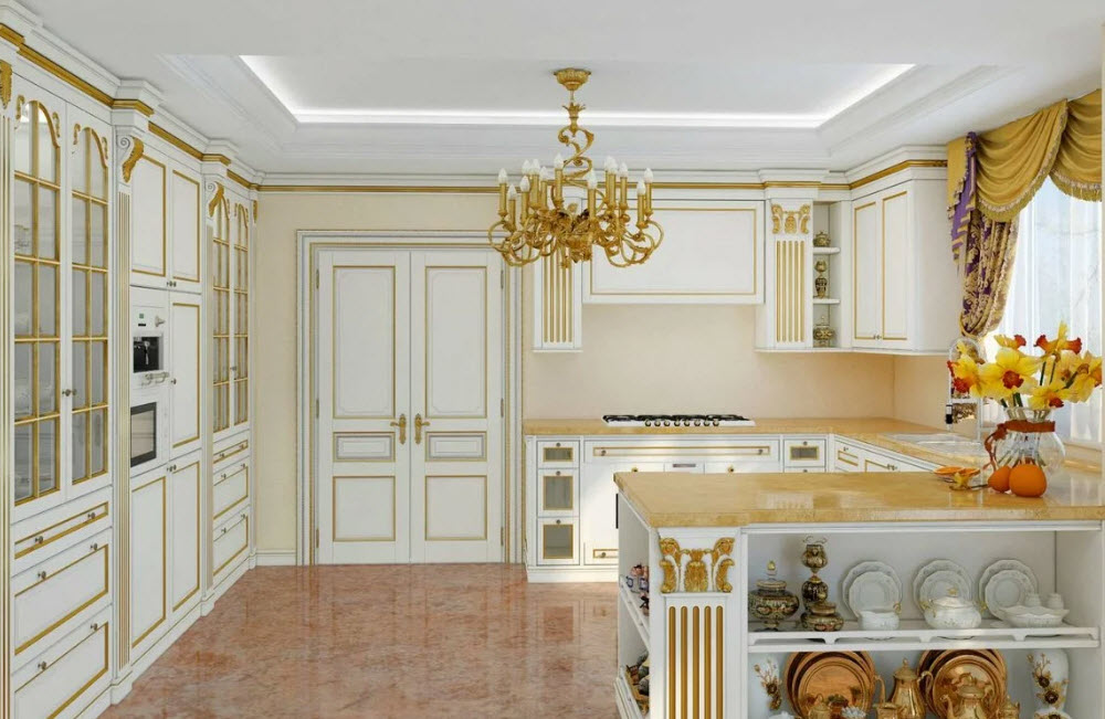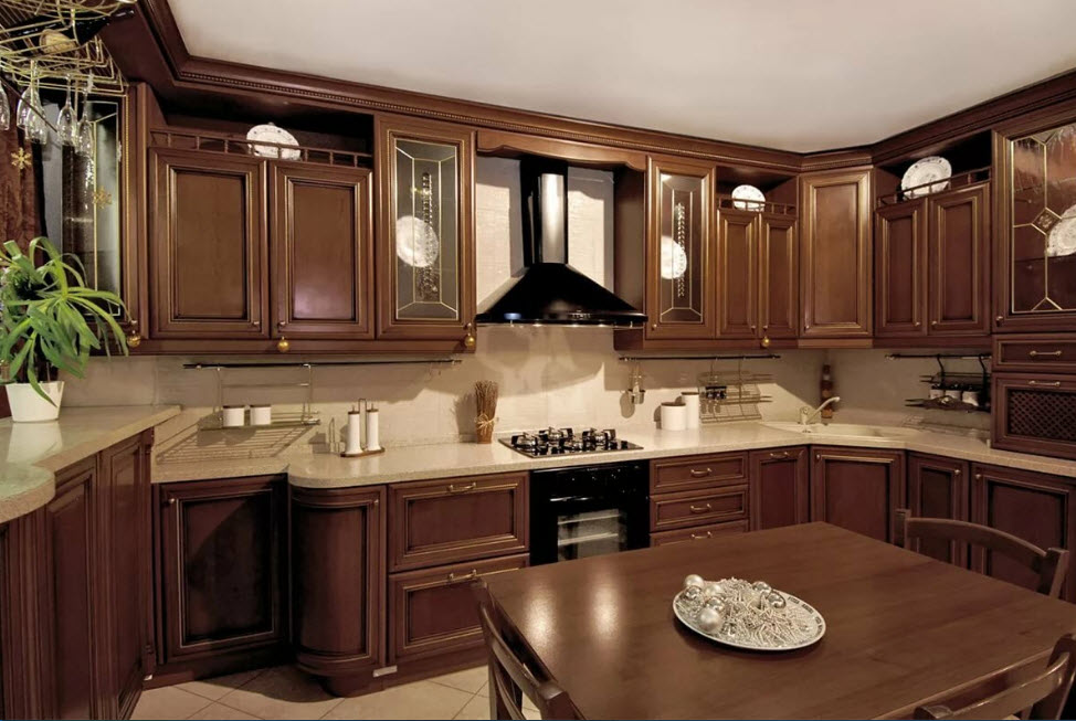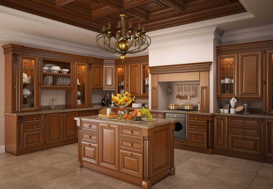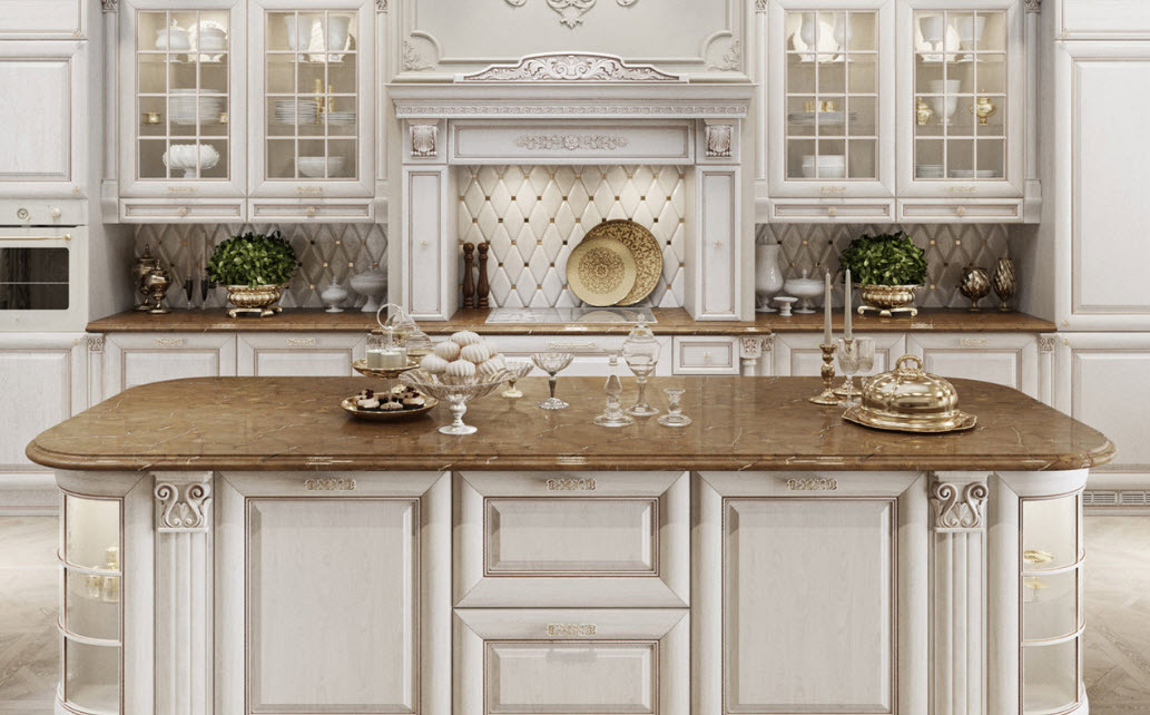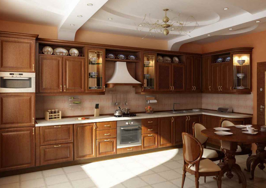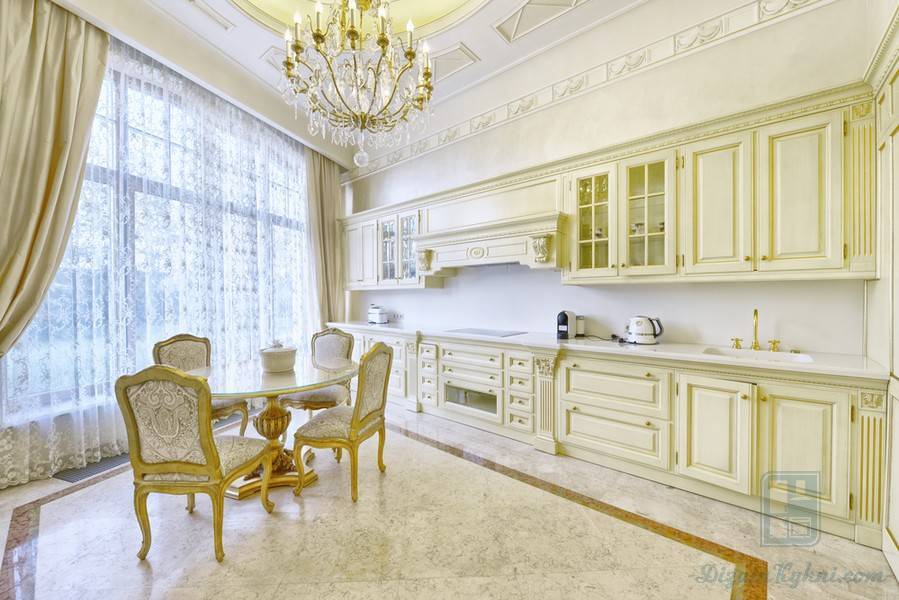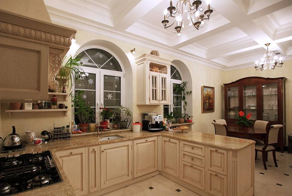 Недорогие синтетические материалы способны «удешевить» кухню, и превратить ее в обычное затрапезное помещение с банальным «евроремонтом». Подчеркнуть изящество и элегантность классического интерьера кухни поможет изысканный декор поверхностей: лепнина, позолота, резьба. Обстановка должна быть благородной и торжественной.