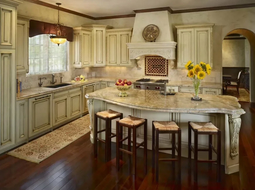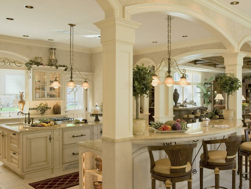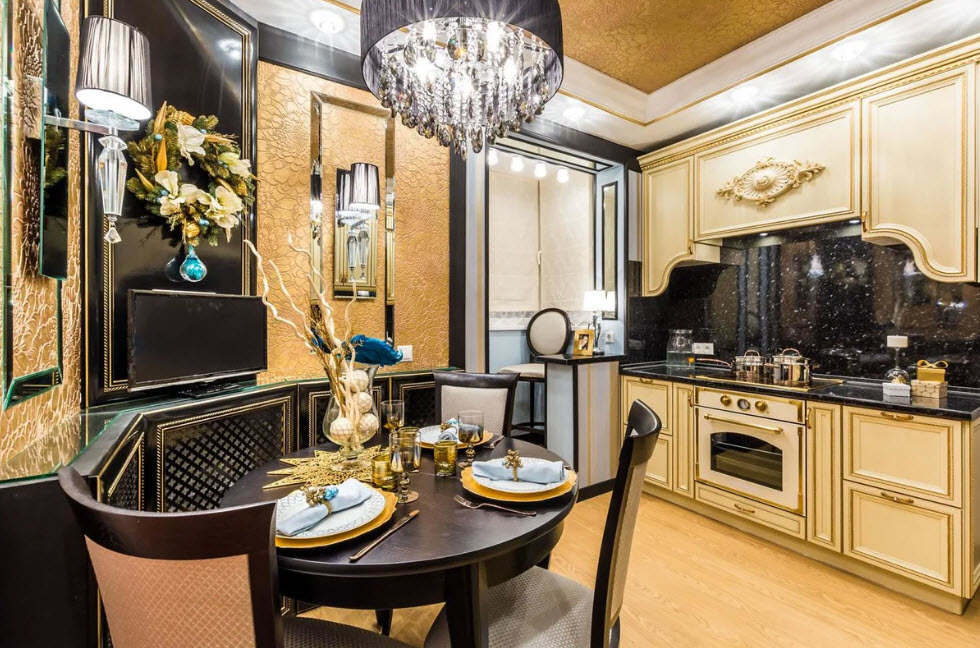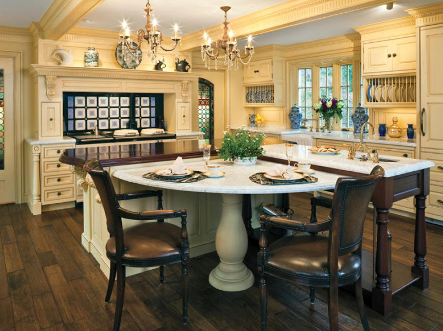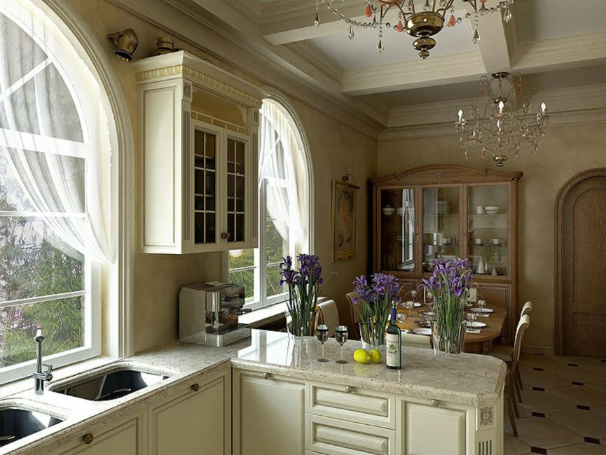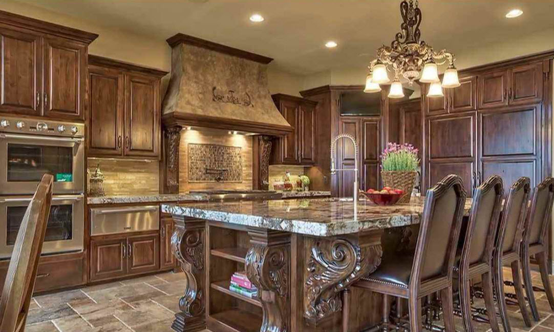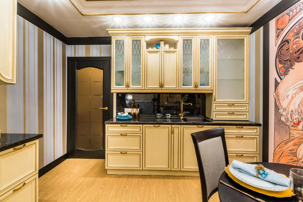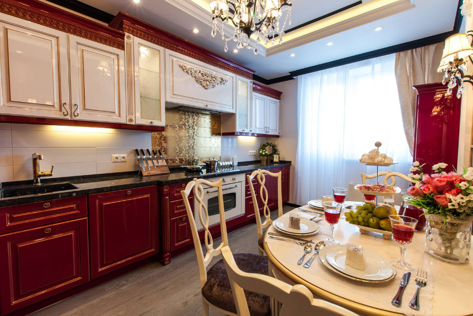 Недорогие синтетические материалы способны «удешевить» кухню, и превратить ее в обычное затрапезное помещение с банальным «евроремонтом». Подчеркнуть изящество и элегантность классического интерьера кухни поможет изысканный декор поверхностей: лепнина, позолота, резьба. Обстановка должна быть благородной и торжественной.