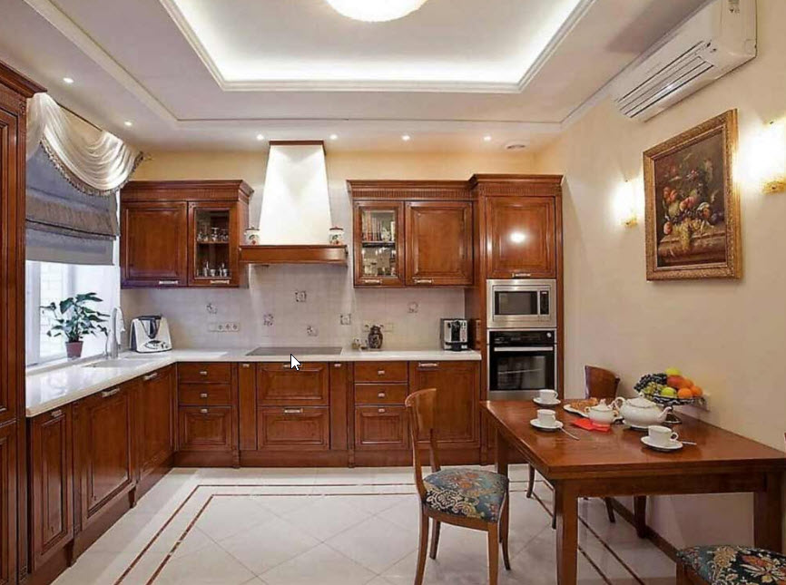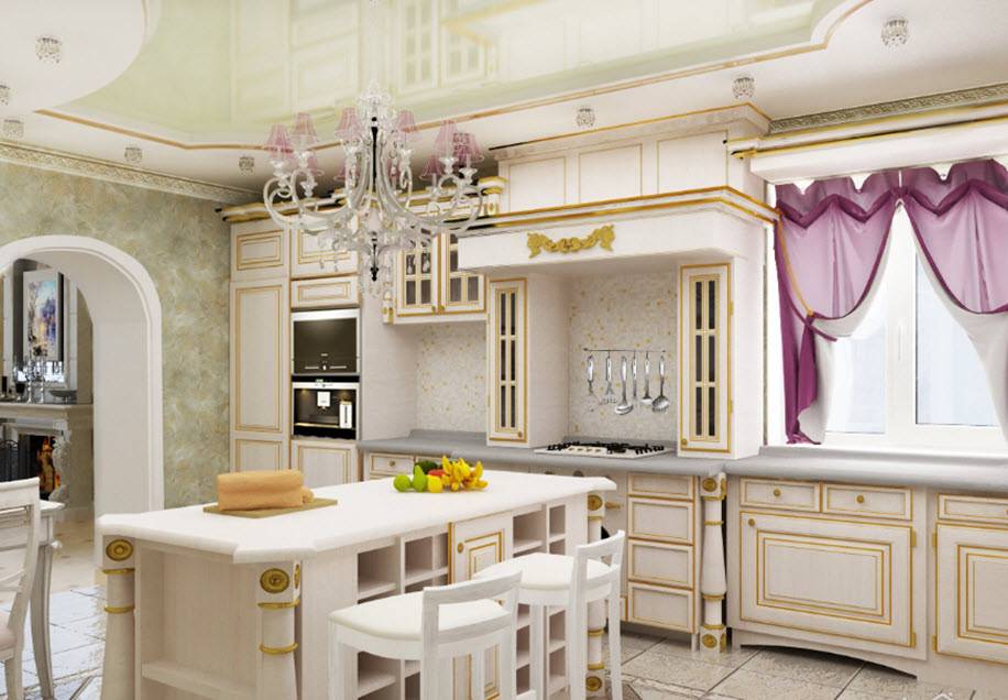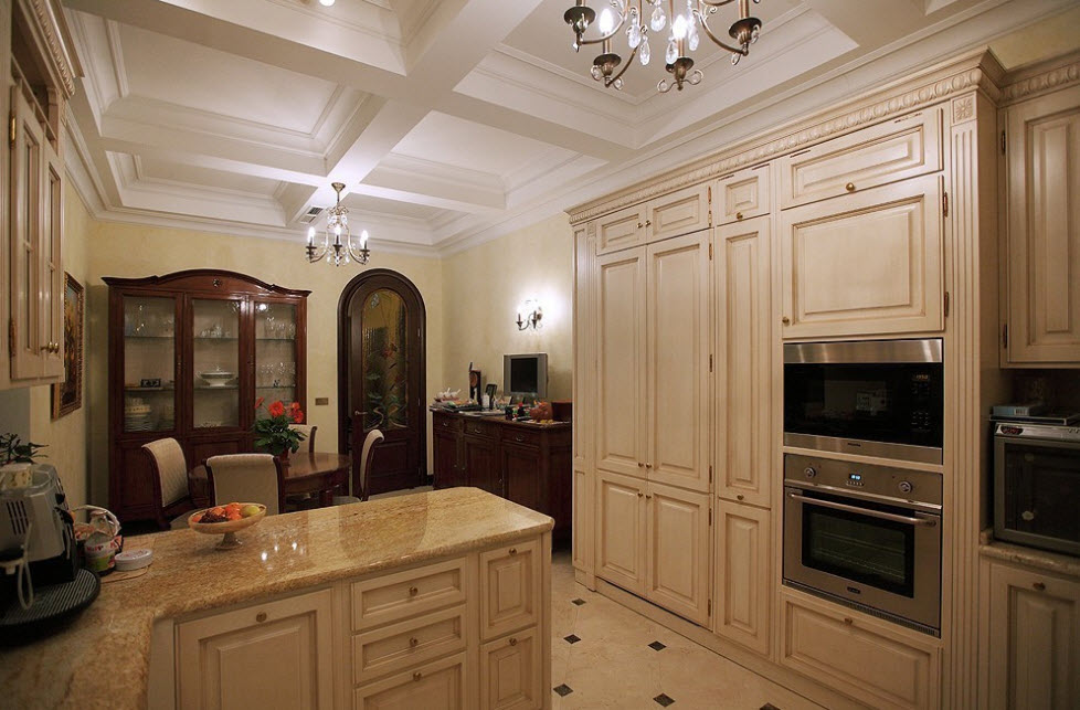 Классический образ кухонного помещения подчеркнет ровный белёный потолок, по периметру украшенный гипсовой лепниной. Отлично подойдет натяжной или подвесной вариант, но нужно помнить, что для классики приемлемы только матовые варианты.