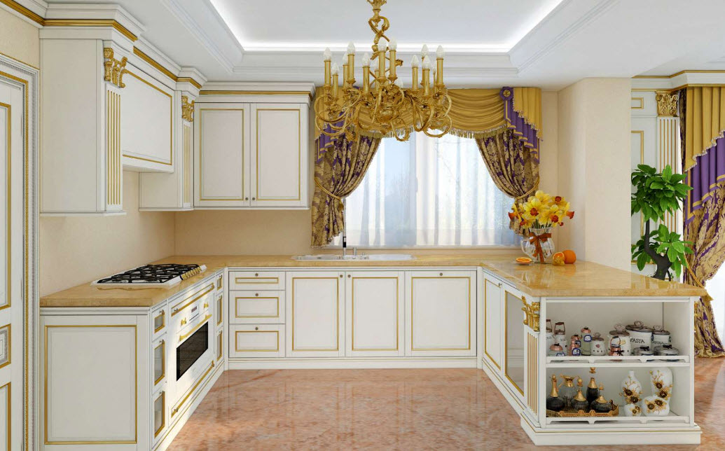 Не менее важным элементом интерьера кухни служит текстиль, создающий правильную атмосферу. Для кухни лучше всего использовать однотонный текстиль светлой палитры, украшать который могут геометрические узоры и золотистый орнамент. Для занавесок можно использовать атлас, сатин и парчу. В качестве декора здесь можно использовать: