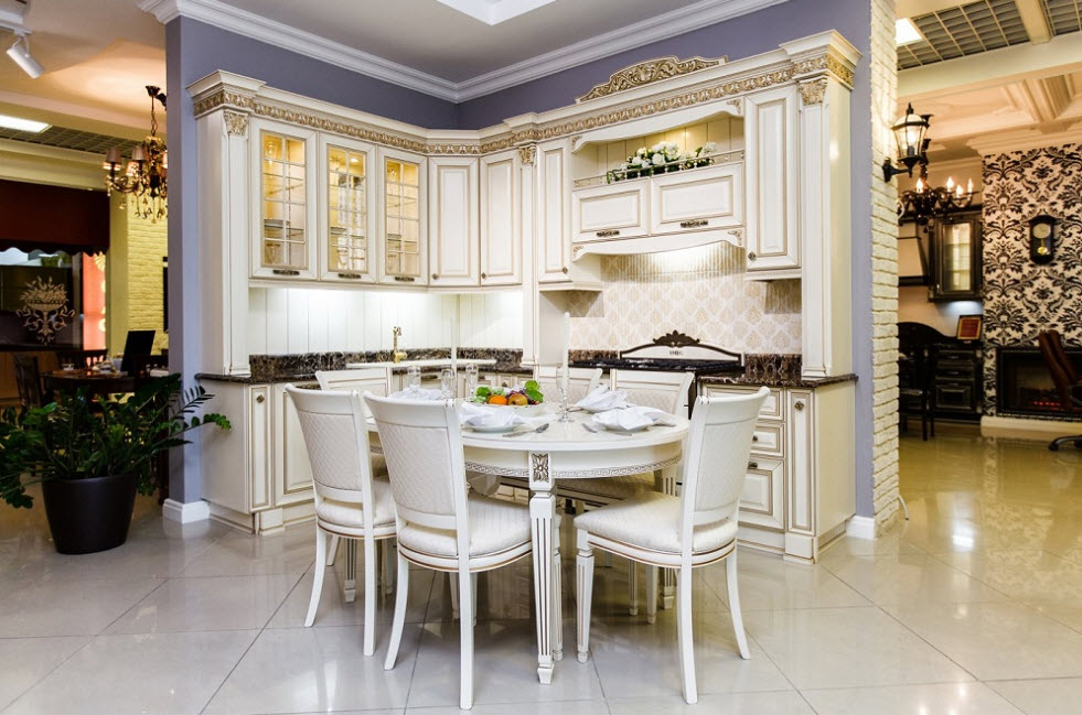 Неотъемлемой частью классического стиля является белая палитра, которая применяется в потолочной, стеновой или напольной отделке. Кухня в молочных, кремовых или ванильных цветах считается показателем тонкого вкуса.