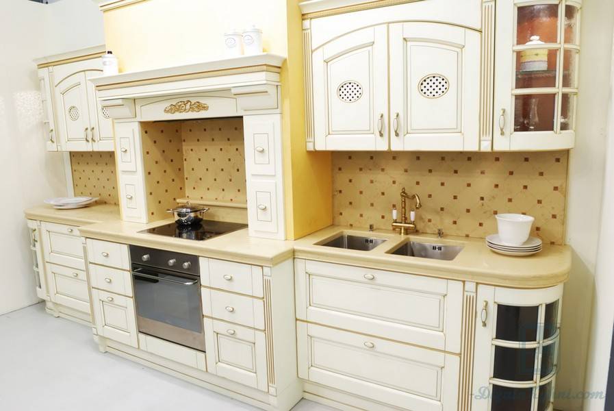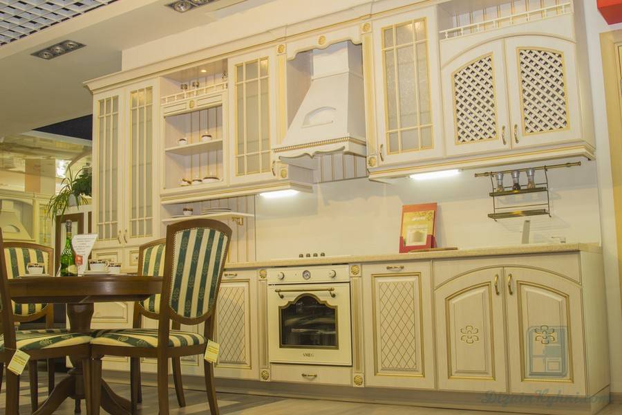 Еще одно достоинство плиты МДФ – она хорошо поддается обработке и принимает любую форму, что делает ее излюбленным материалом для дизайнеров. Выполненная из него классическая кухня с резьбой, карнизами и множеством декоративных элементов очень внешне похожа на вариант из массива.