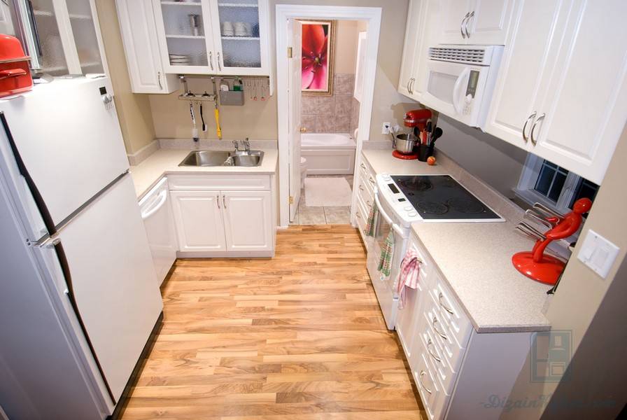 Гостинная зона может быть практически незаметной. Предпочитаете проводить свободное время на кухне? Такой ход полностью оправдан. Шкафы по периметру, небольшой диван со столиком – и вы получаете в свое распоряжение огромное кухонное помещение.