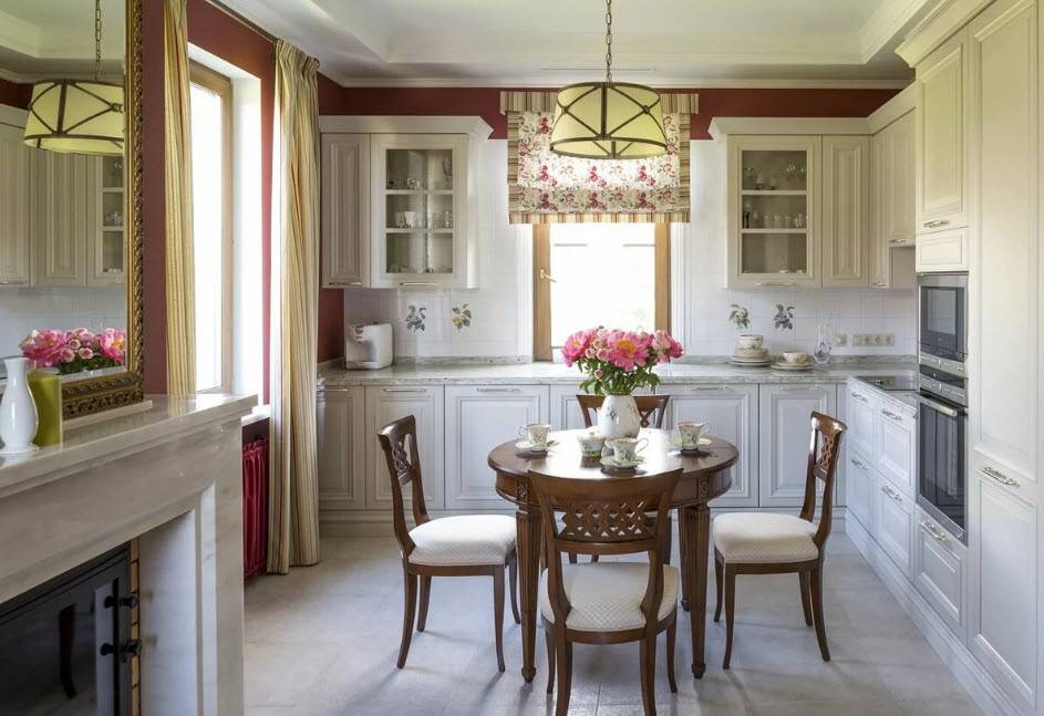 На фото светлая кухня классика представлены другие интересные идеи использования текстиля и аксессуаров.