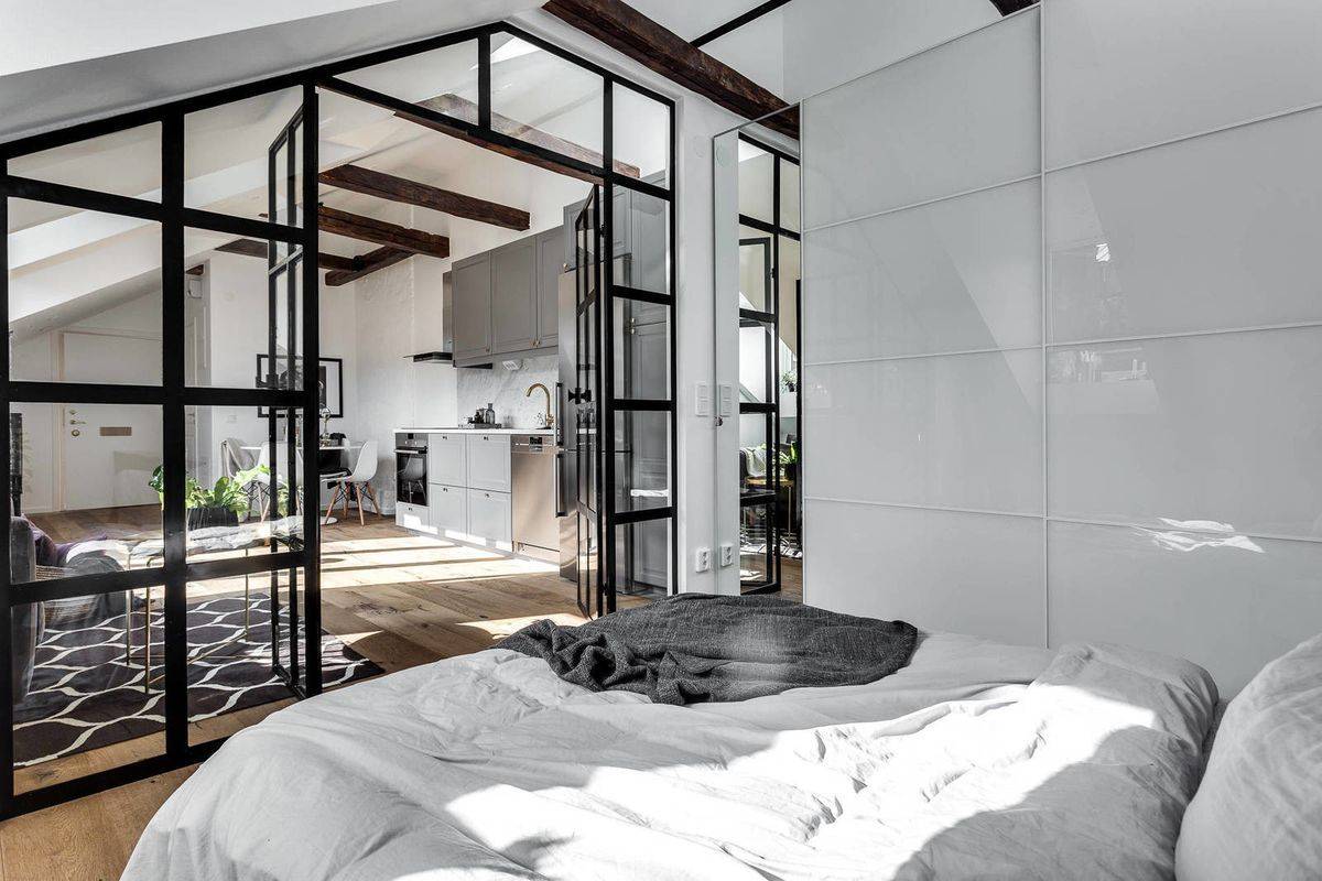 Спальня отделена каркасной стеклянной перегородкой, которая сразу привлекает к себе внимание. Прозрачная перегородка позволила не дробить пространство, а сохранить целостность большой комнаты и чувство свободного пространства в маленькой квартире