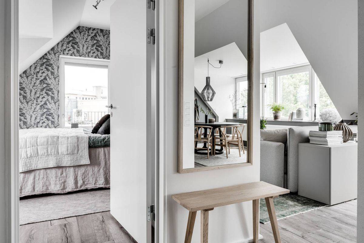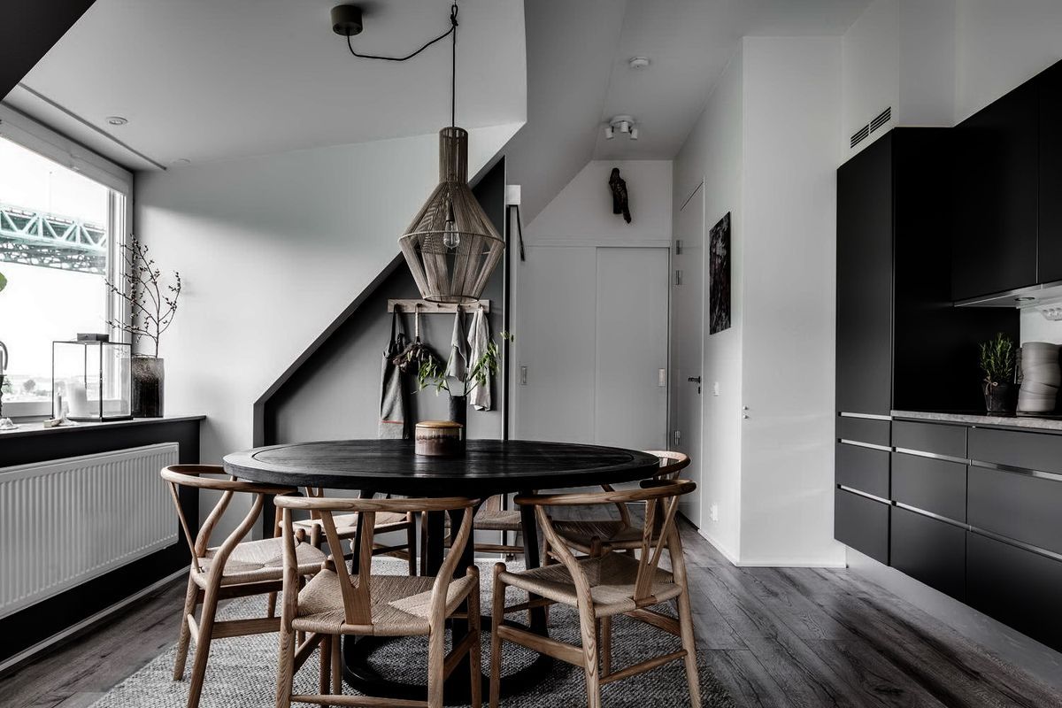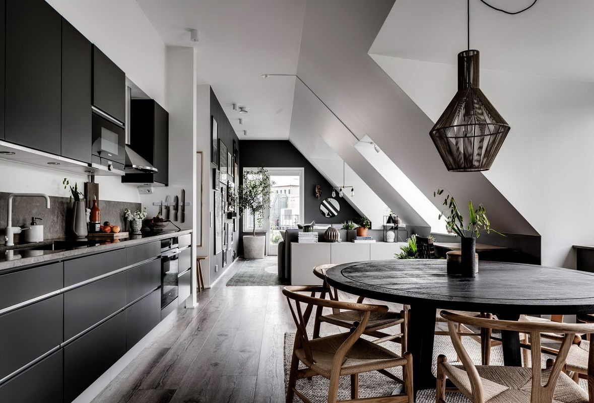 Двухкомнатная квартира на мансарде имеет площадь 70 квадратных метров и выполнена в современном скандинавском стиле. Работа с цветом, в данном проекте, может стать эталонным примером использования цветовой гаммы на основе серого. Резкий контраст и чёткие образы завораживают своей простотой и стильностью.