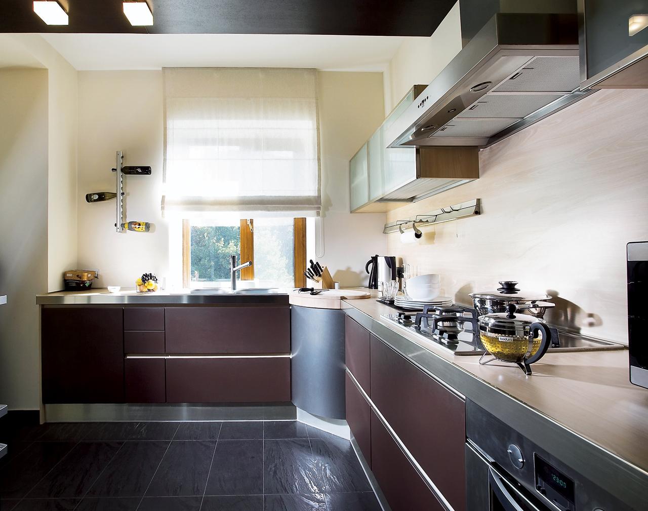 Угловая кухня.Параллельная. При такой планировке гарнитур располагается у двух противоположных стен, занимая их полностью или частично. Часто к такой планировке прибегают в случае продолговатых кухонь.