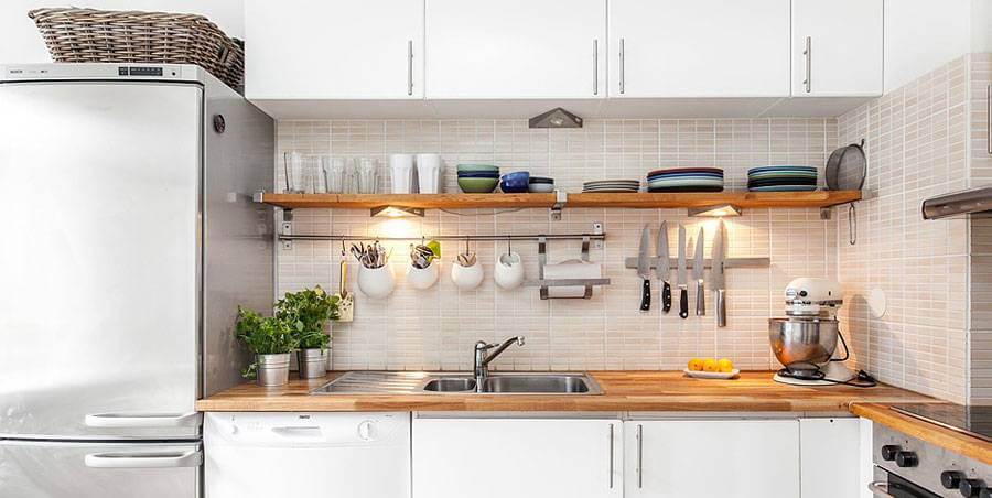 Эталон: белый потолок, гладкие светлые поверхности, белоснежный или яркий фартук и пол под выбеленное дерево или плитку. Функциональная мебель и изобилие освещения – это то, что придает кухне особый уют и тепло.
