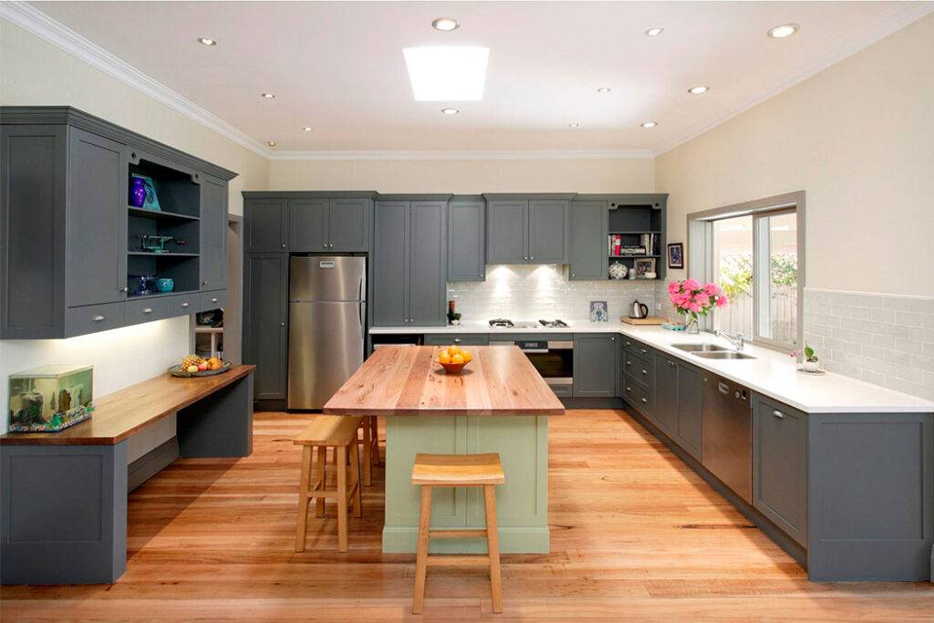 Наиболее универсальной и практичной считается угловая планировка. Такой вариант подходит для больших и маленьких помещений, в отличие от параллельной или линейной планировки, которые сложно вписать в небольшие квадратные кухни, например.