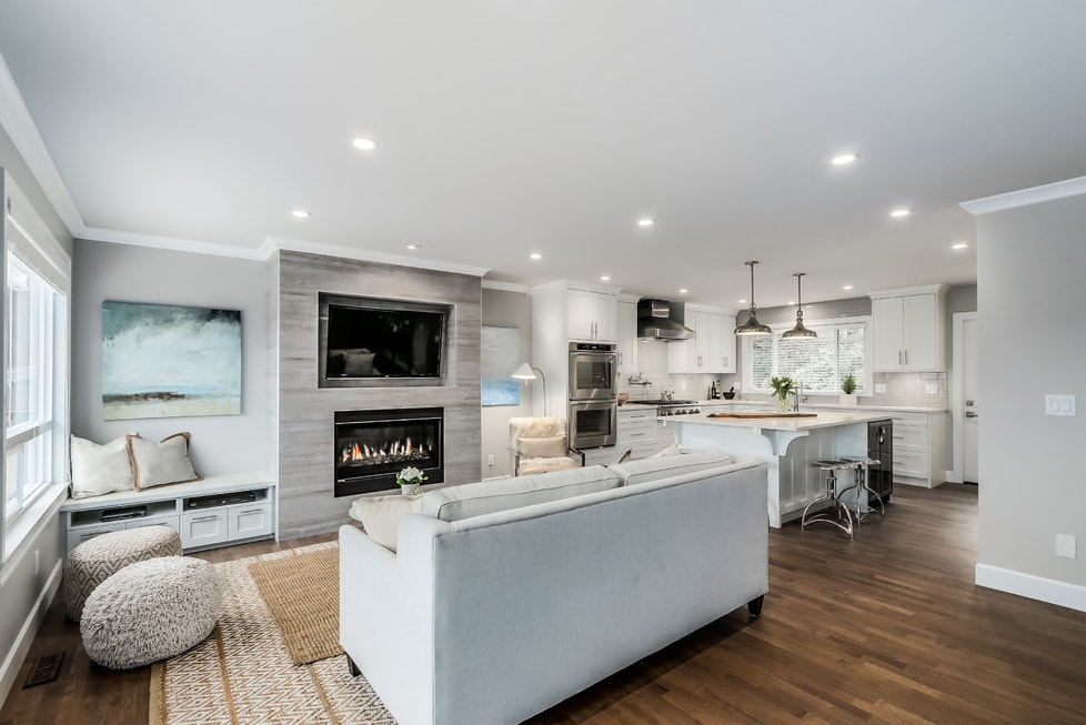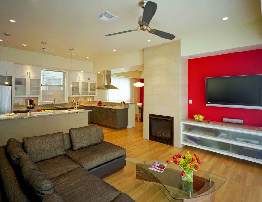 Этот дизайн – пример того, что совмещенная кухня-гостиная может быть выполнена в абсолютно разных стилях для визуального разделения. Здесь мы видим кухню в теплых оттенках, которая выглядит очень уютно, несмотря на простоту и лаконичность. С другой стороны, гостиная выполнена в холодных тонах. Но несмотря на такое противостояние стилей, интерьер выглядит особенно интересно.