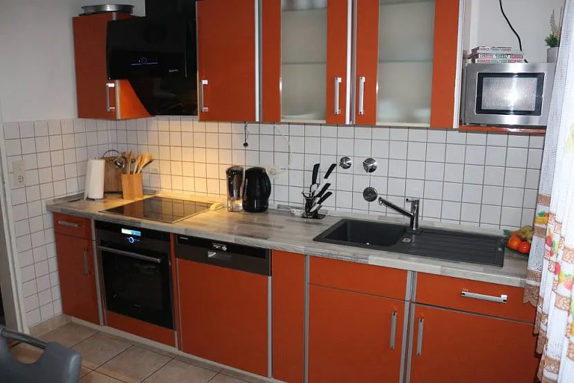 Злоупотребление темными поверхностями визуально уменьшает кухню, попутно излишне акцентируя внимание на оранжевых элементах