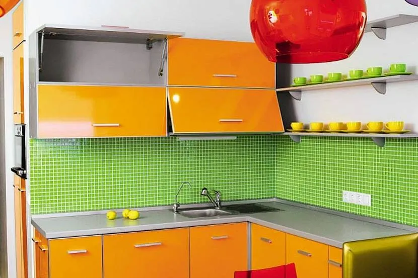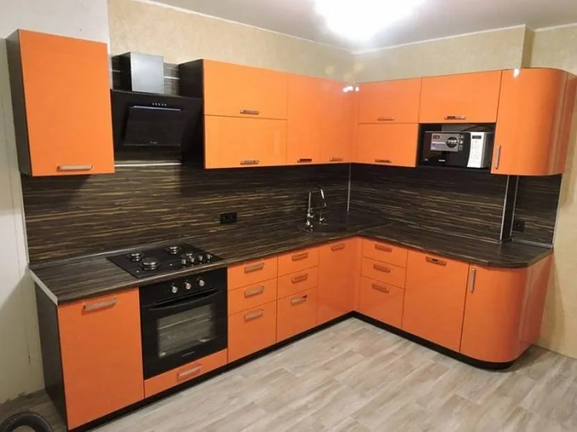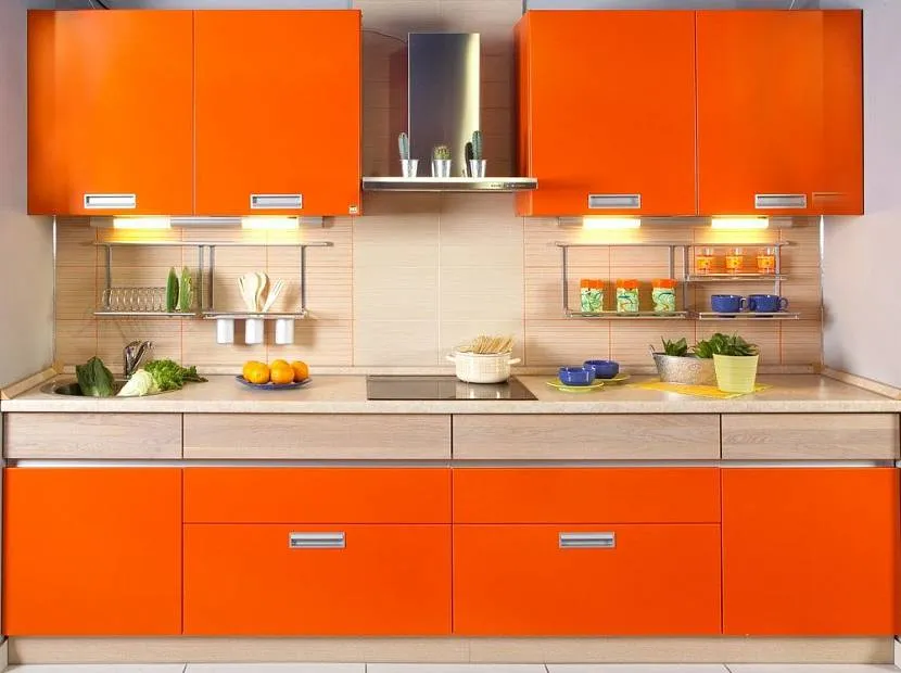 Яркий гарнитур хорошо сочетается со сдержанными тонами оформления стены над рабочей зоной. В качестве отделочных материалов подойдут обои, деревянные панели, плитка, облицовочный камень. Яркие глянцевые фасады кухонного гарнитура можно дополнить фартуком из стекла с фотопечатью или фотообоями с тематическими рисунками. В оранжевой окантовке хорошо смотрятся изображения цитрусовых фруктов, кофе, цветов и абстрактных узоров.