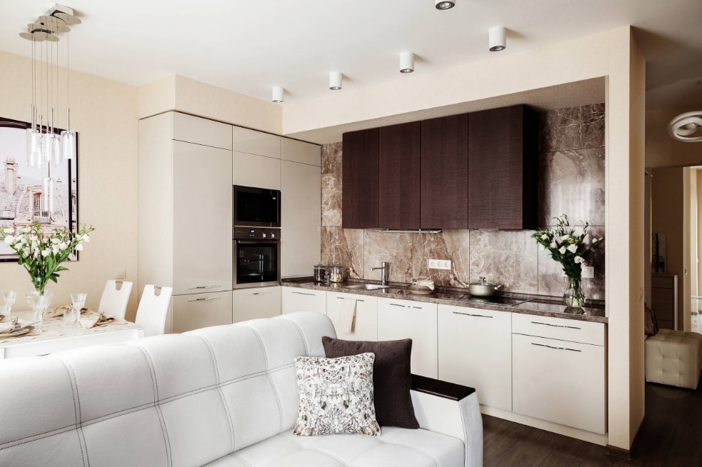 Данный вариант кухни-гостиной очень функциональный и выполнен правильно. Во-первых, стоит отметить очень удачное зонирование. А сочетание нескольких оттенков коричневого и бежевого цвета очень хорошо подчеркивает и разделяет каждую из зон.